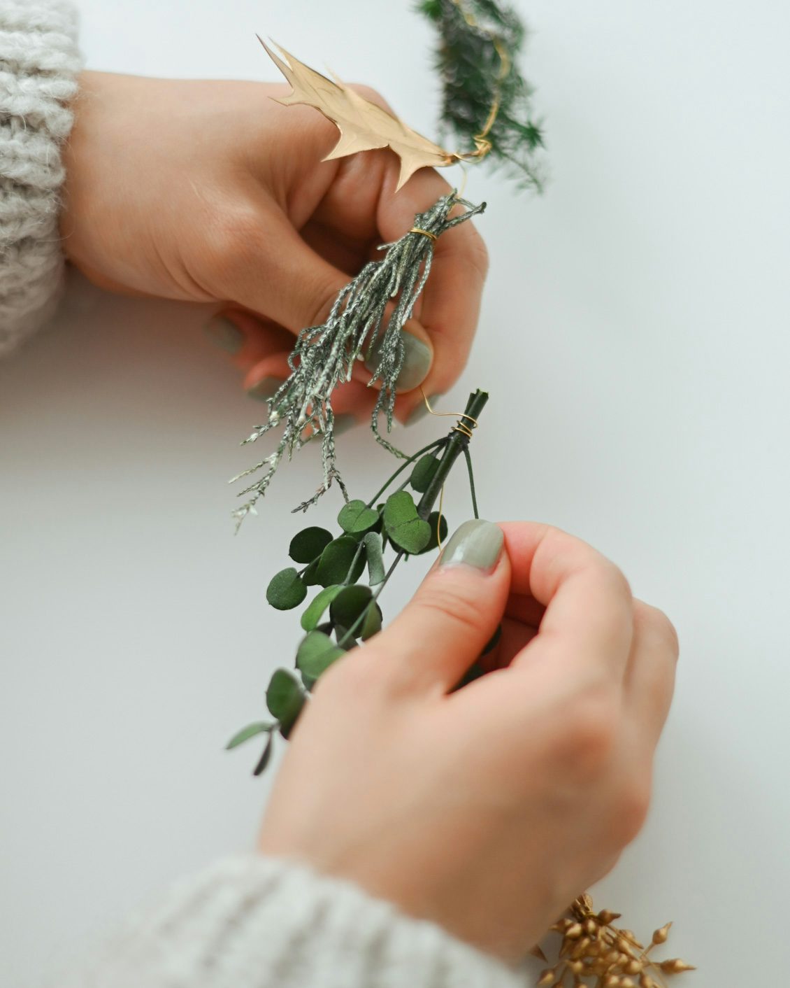 バランスを見ながら、お好みの順番で花材にワイヤーを巻きつけていきます。