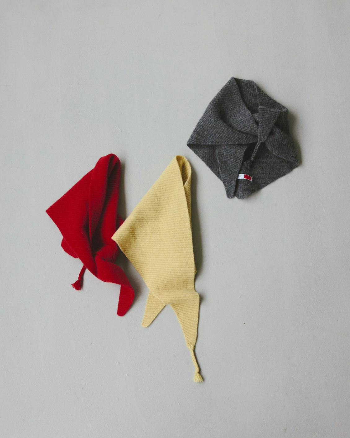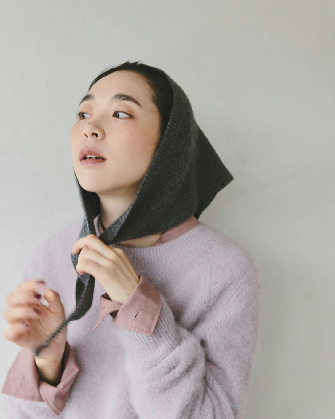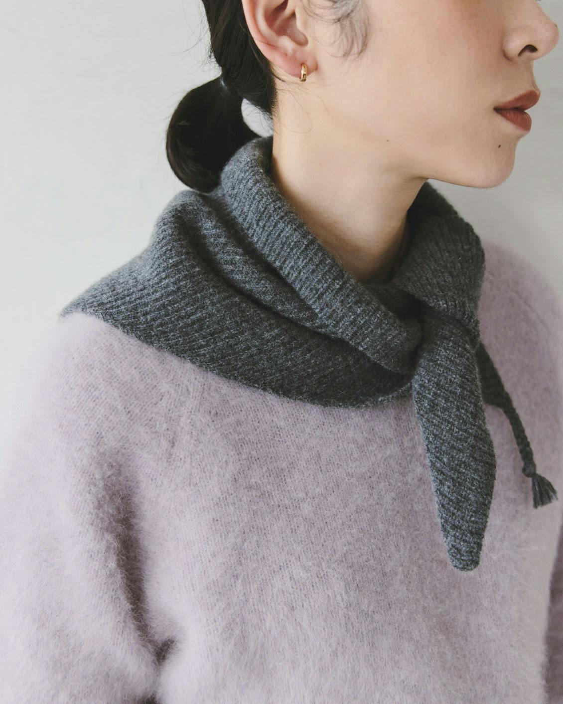 スカーフの形状は、アレンジしやすい長めの三角形 。大判ストールほど気負わず、スカーフよりも暖かい。そんな「ちょうどよさ」が魅力です。