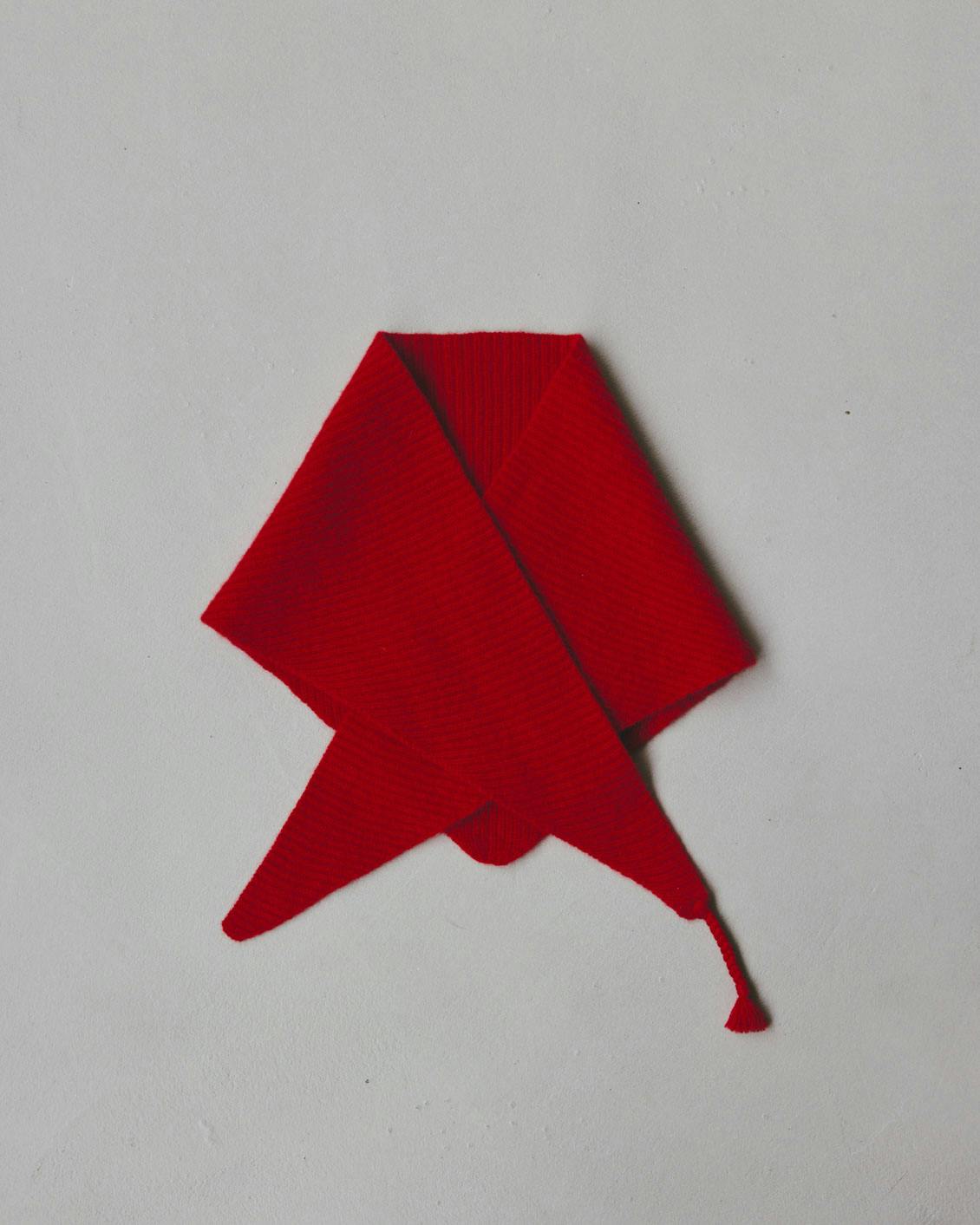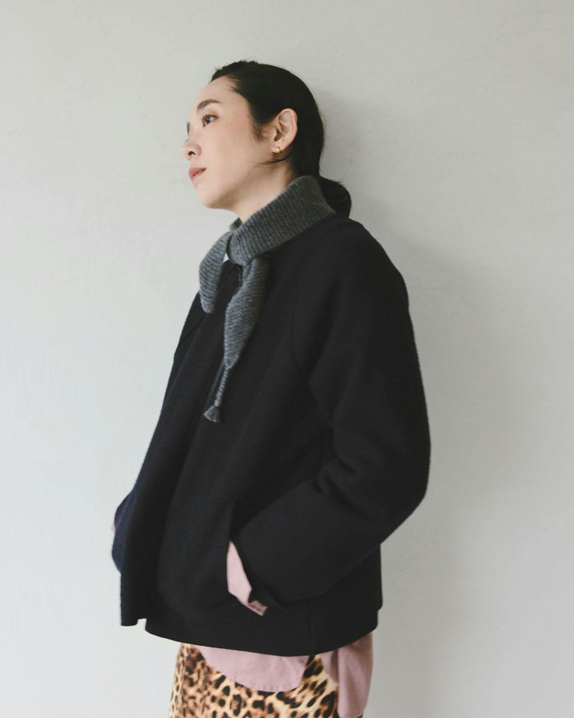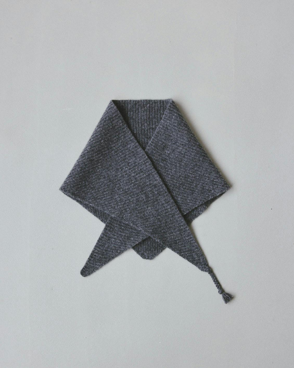 スカーフの形状は、アレンジしやすい長めの三角形 。大判ストールほど気負わず、スカーフよりも暖かい。そんな「ちょうどよさ」が魅力です。