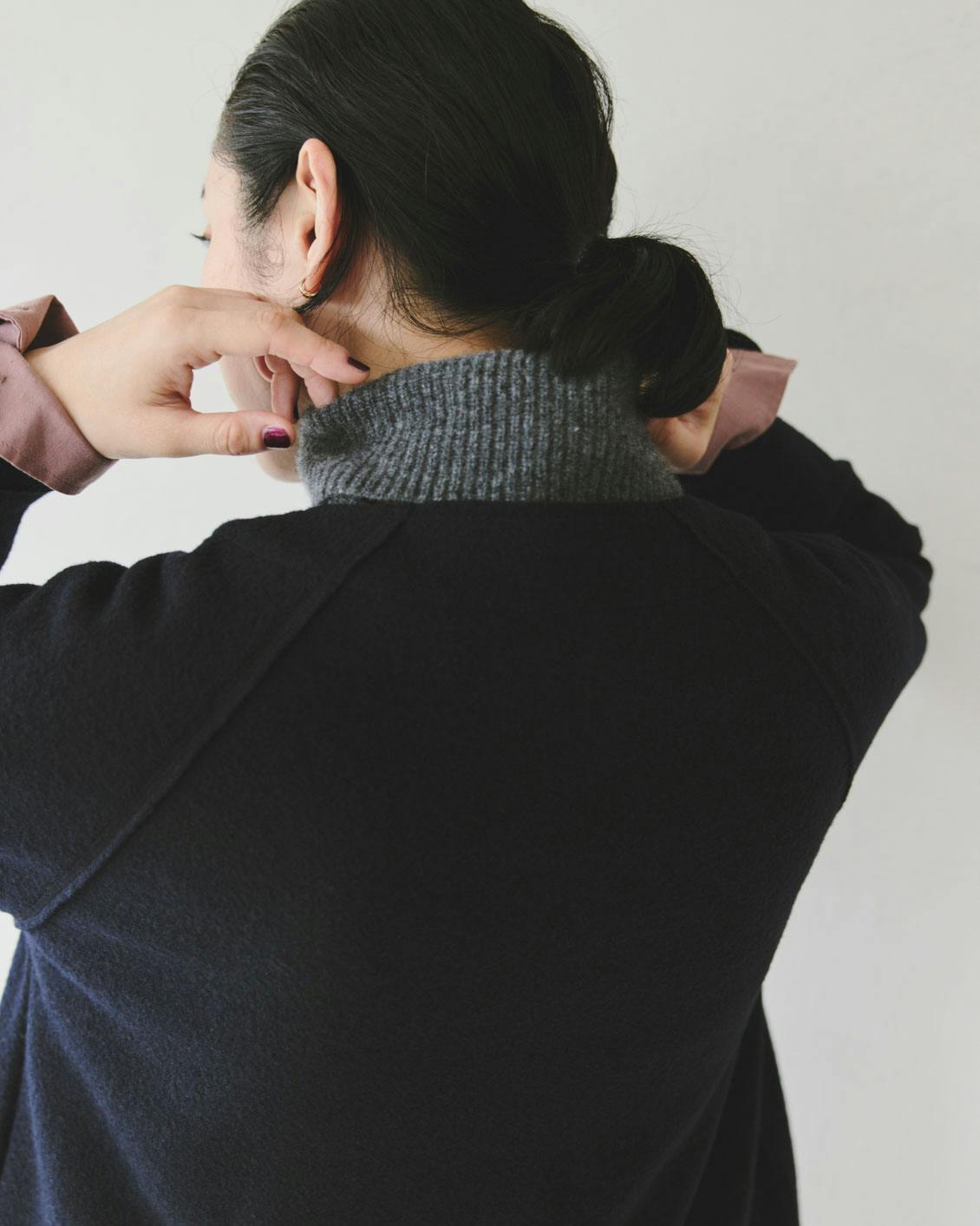 薄手でコンパクトなので、タートルネックやスカーフのように使うのもおすすめです。
