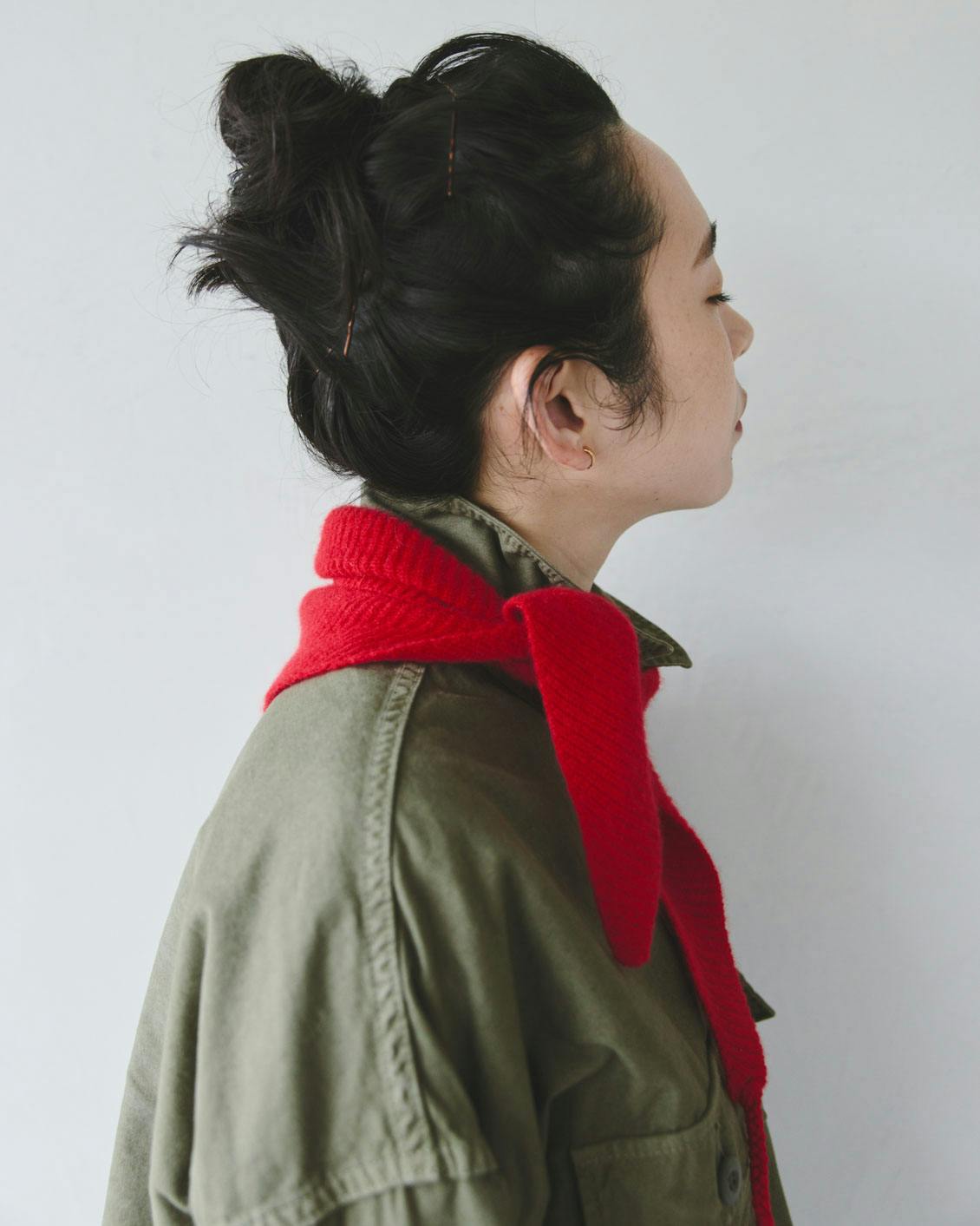 首元にコンパクトにまとまるので、アウターを羽織ってももたつかず、すっきりとした印象に。顔まわりを、さりげなく華やかに見せてくれますよ。