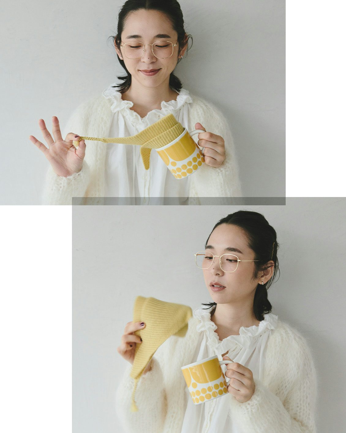 三角形のかたちのおかげで、ただ結んだだけでも、結び目が自然と愛らしいポイントになってくれるんです。