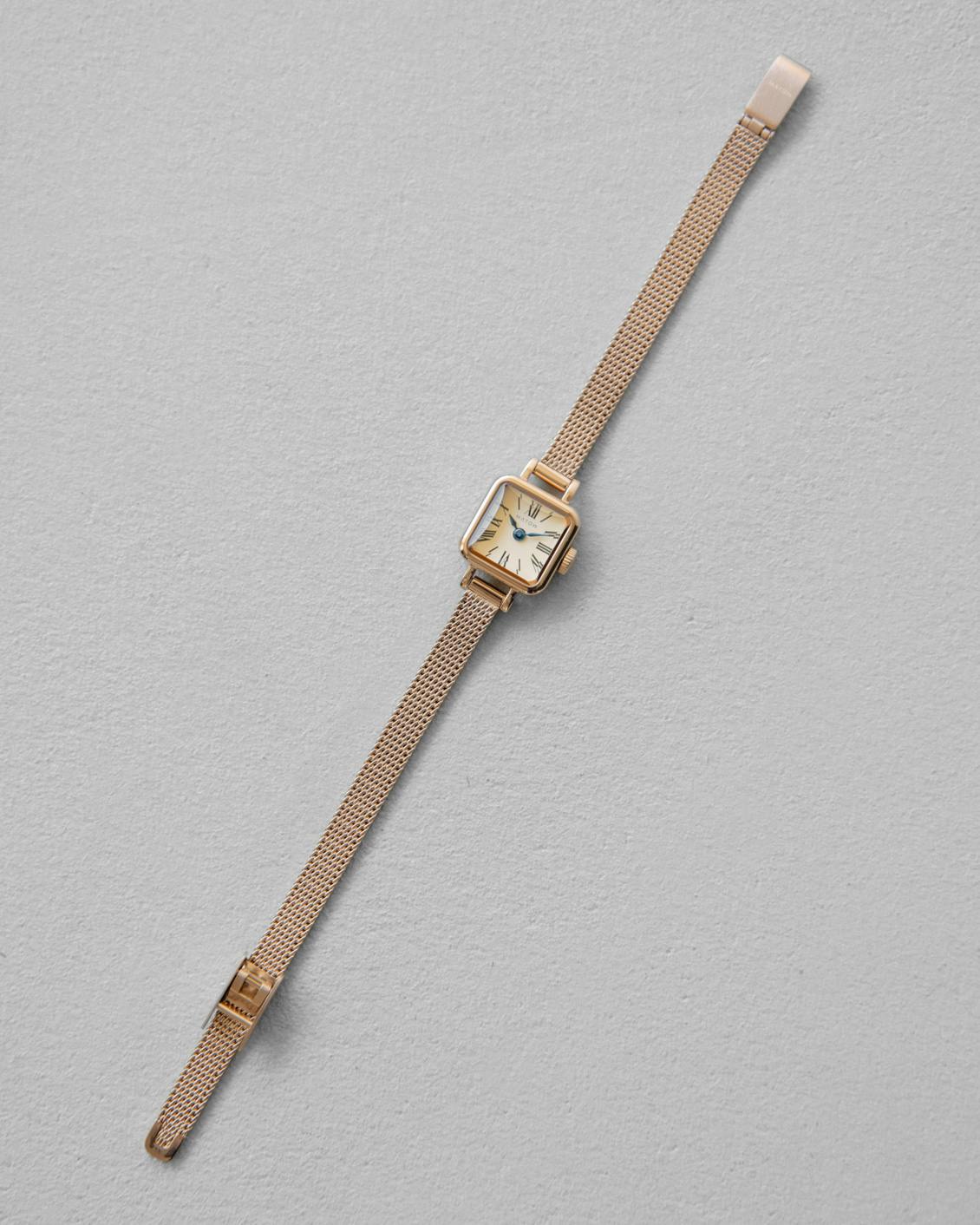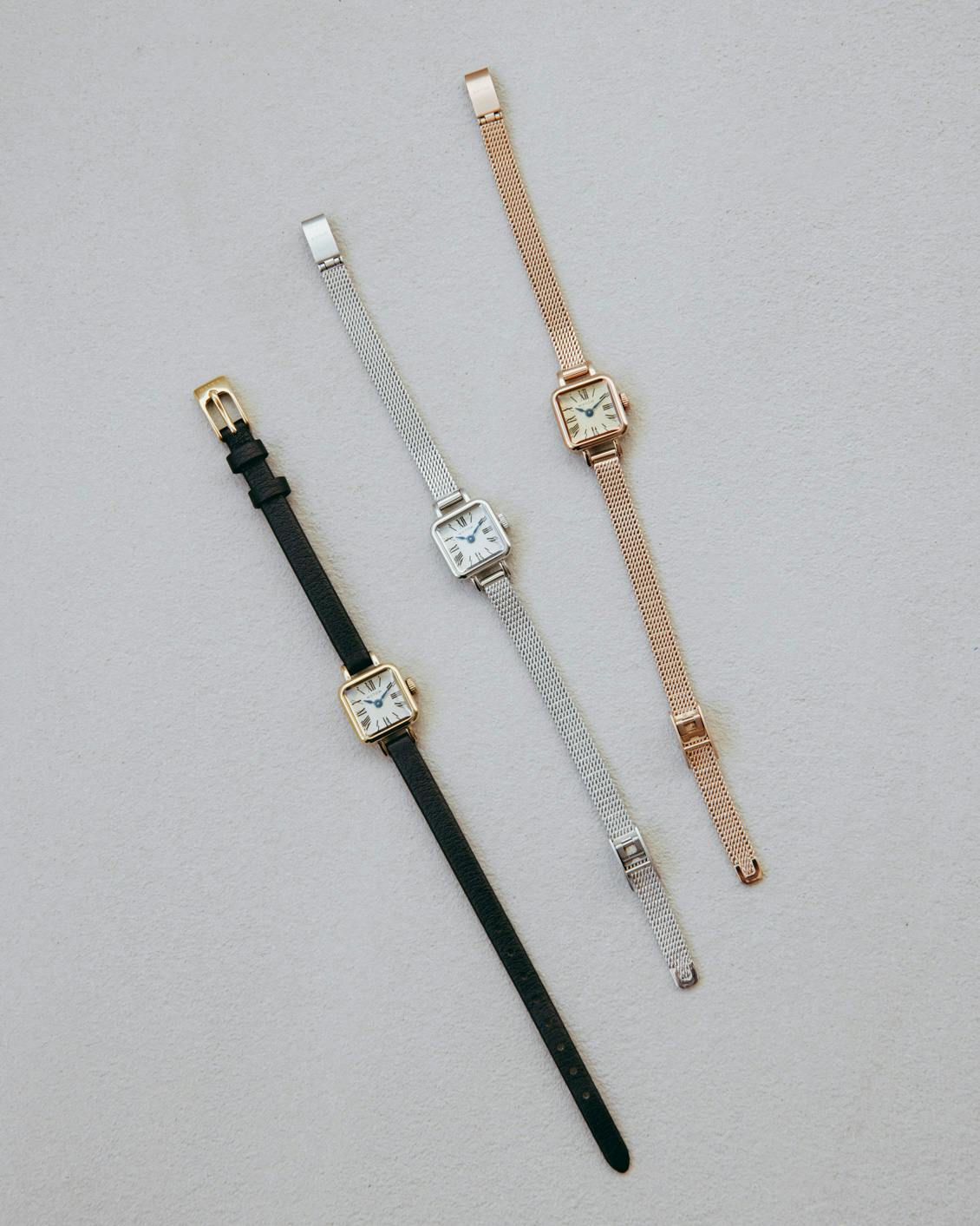 15mm角の小さなフェイスと華奢なベルトが主張しすぎず、けれど装いの仕上げになる、控えめな存在感。