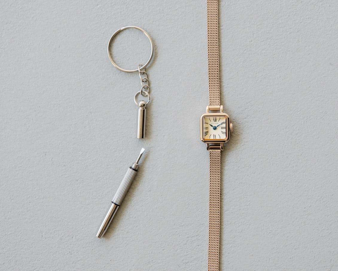メッシュベルトの腕時計には、金具調整用のミニドライバーが付属しています。