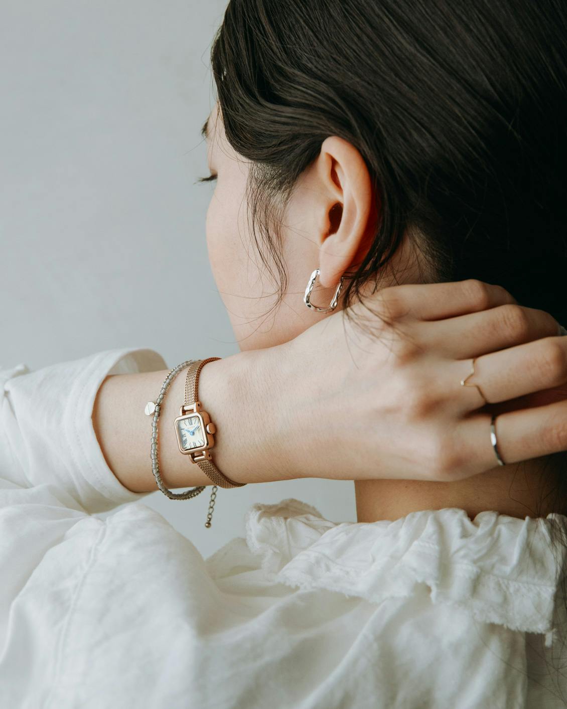 指輪やイヤリングを着けているときも、まるでアクセサリーのひとつのように、すんなりと溶け込むフォルムです。