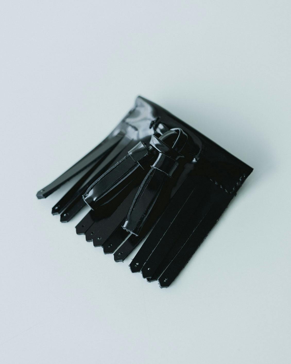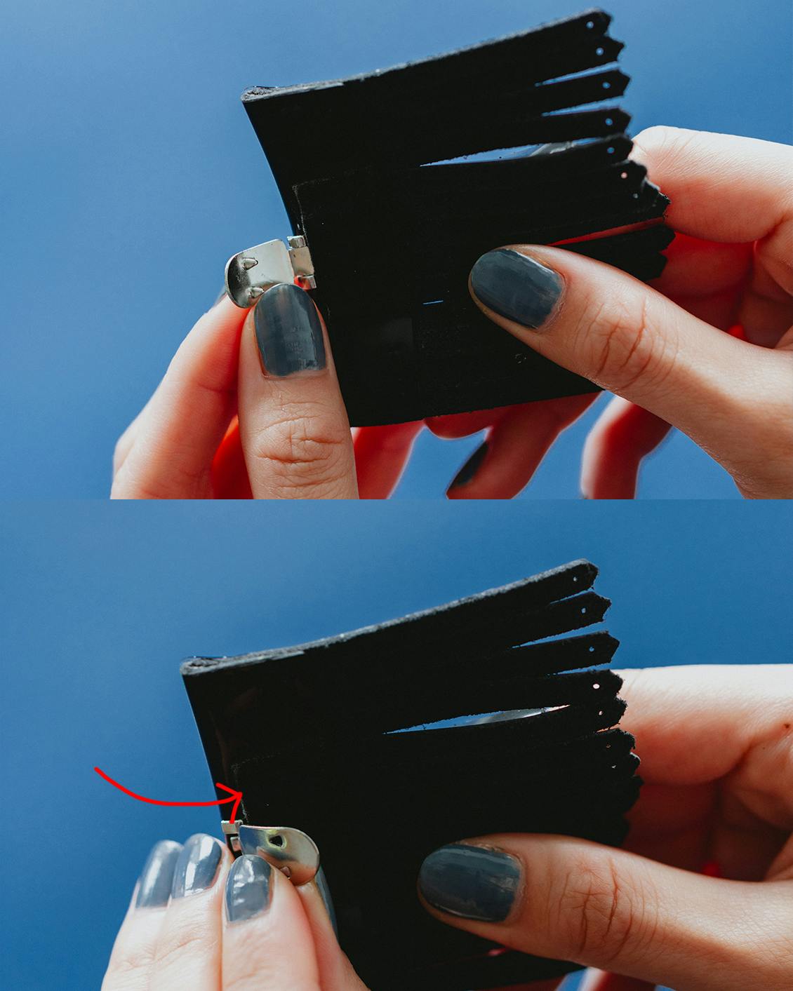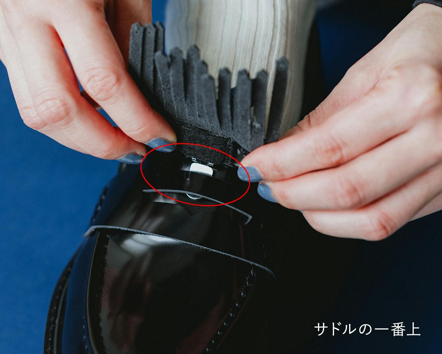 甲部分の革にの上に乗せた帯状のパーツ「サドル」に、タッセルの金具部分を開いて差し込んでお使いください。
