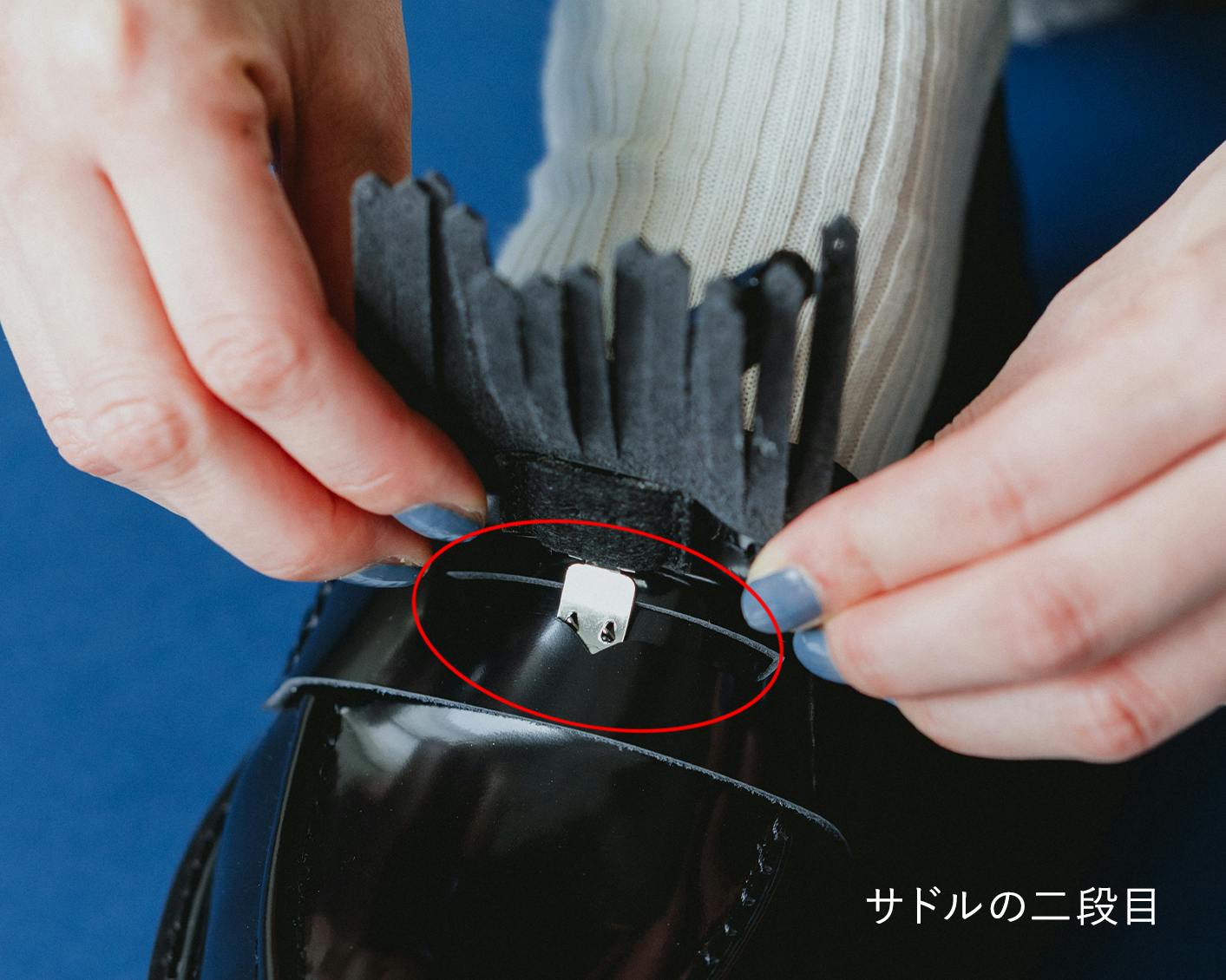 ボトムスの丈で付け位置を変えるのもおすすめ。靴の甲にかかるような丈のボトムスの場合、サドルを二段目にするとタッセルが引っかかりにくく、きちんと見えますよ。