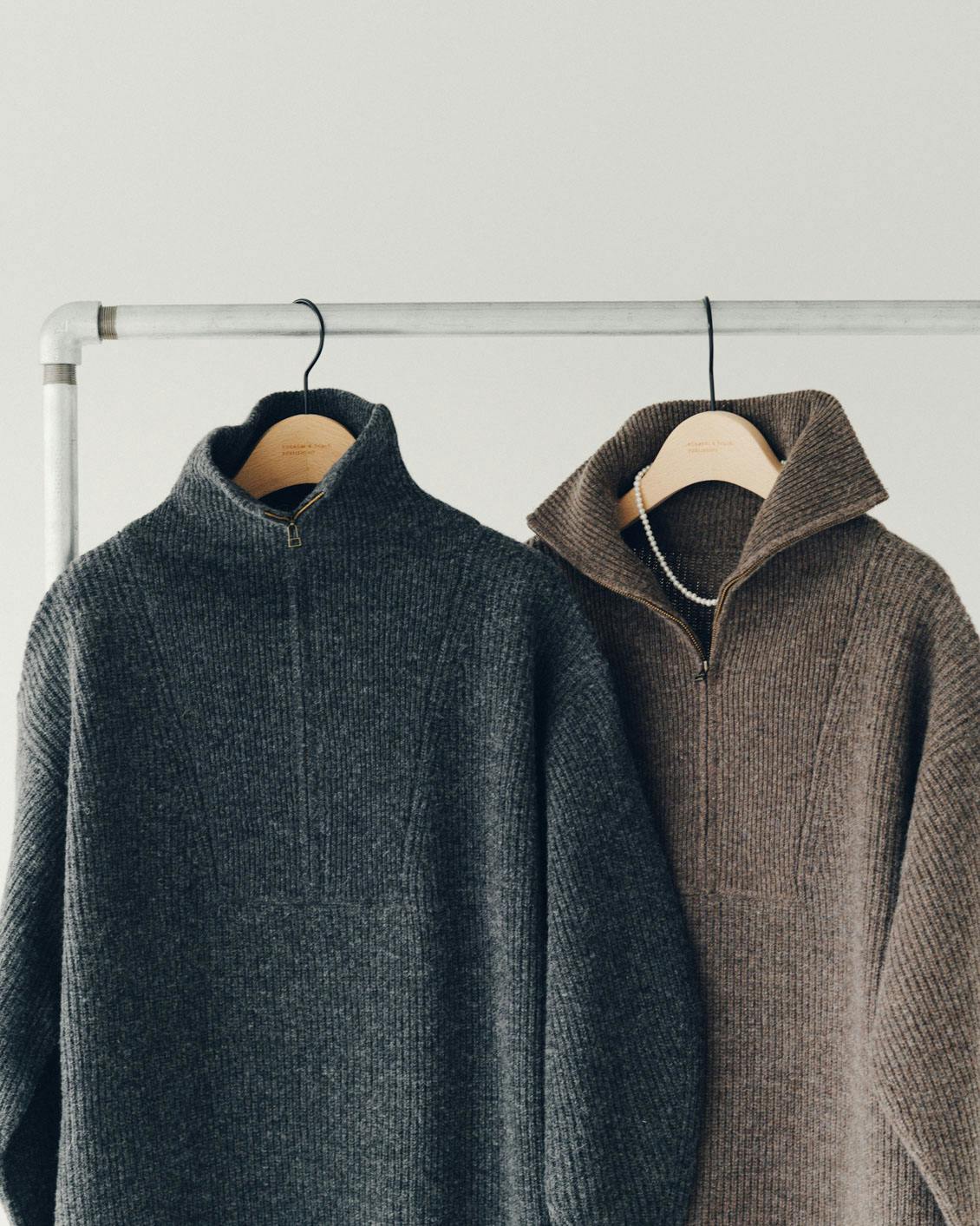 トレンド感もあるハーフジップゆえ、大人が上品に着られるよう大きすぎない襟サイズにし、落ち着いた印象にまとめました。