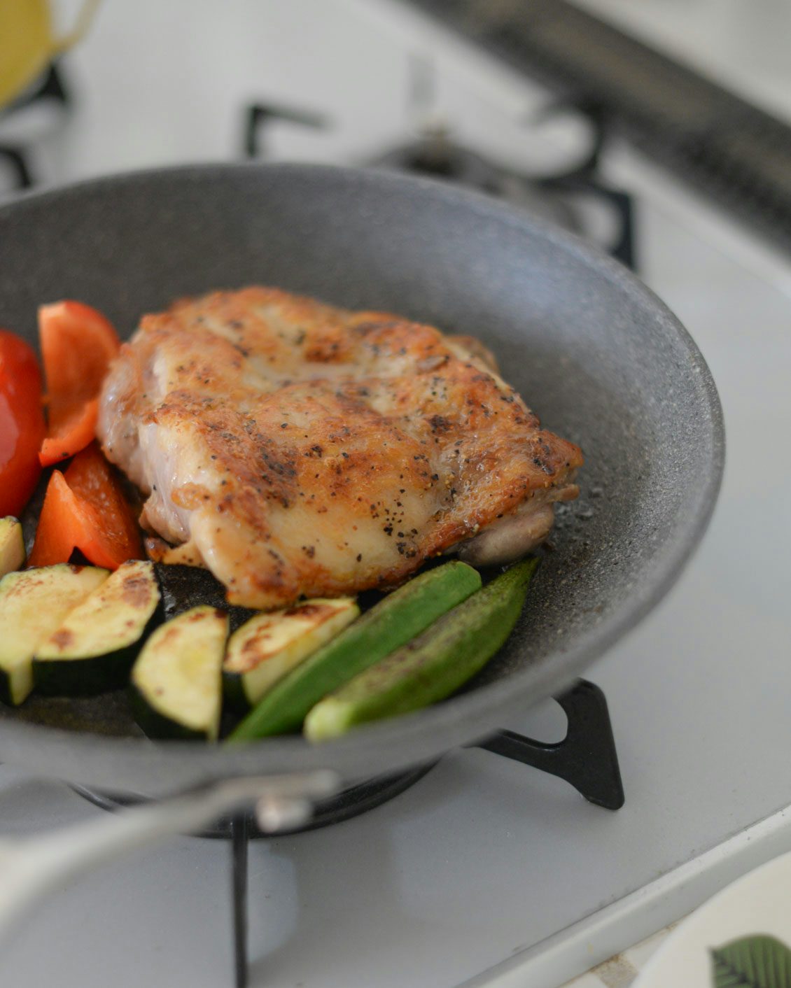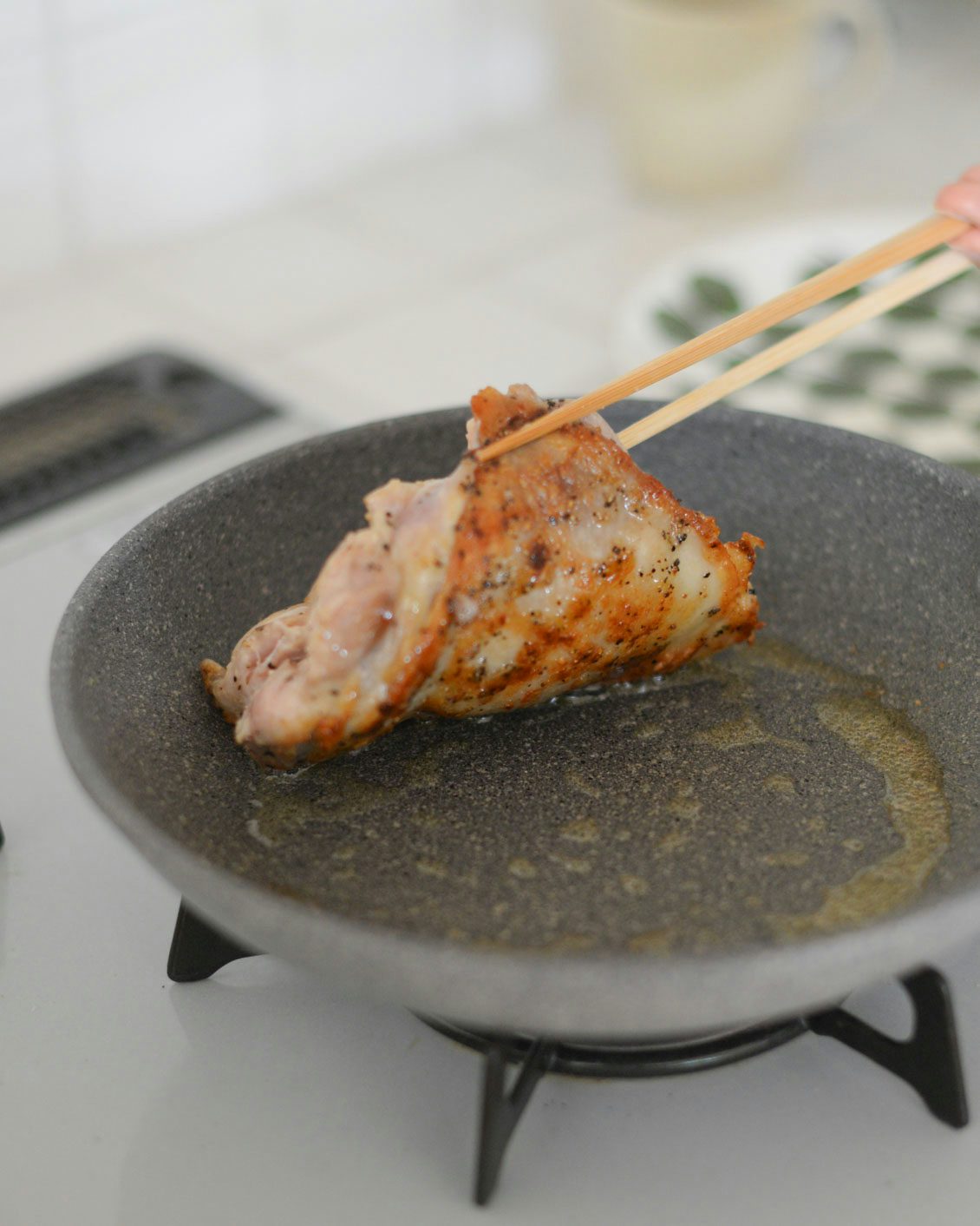 熱がフライパン全体に均一に伝わるので、食材に焼きムラができにくいんです。だから、ハンバーグや鶏肉のソテーはこんがりジューシーに、フレンチトーストや餃子はきれいな焼き目に。