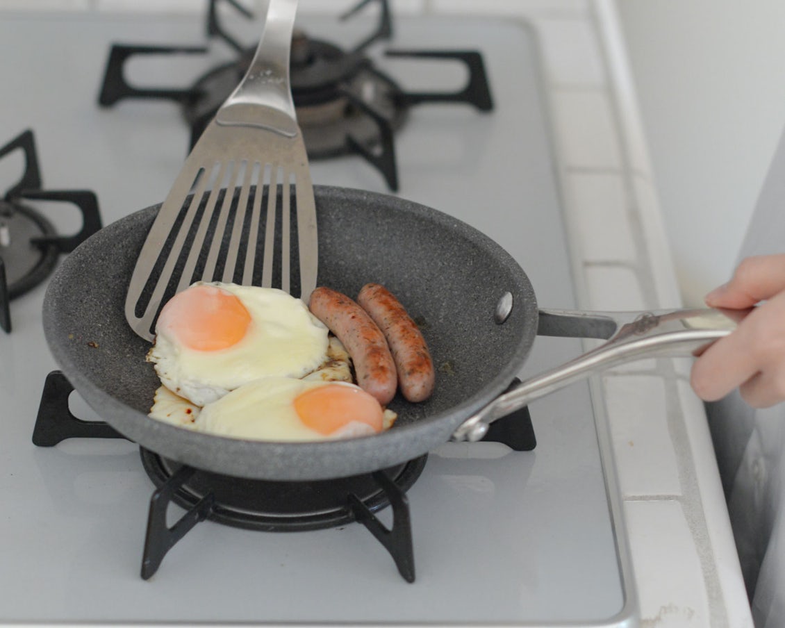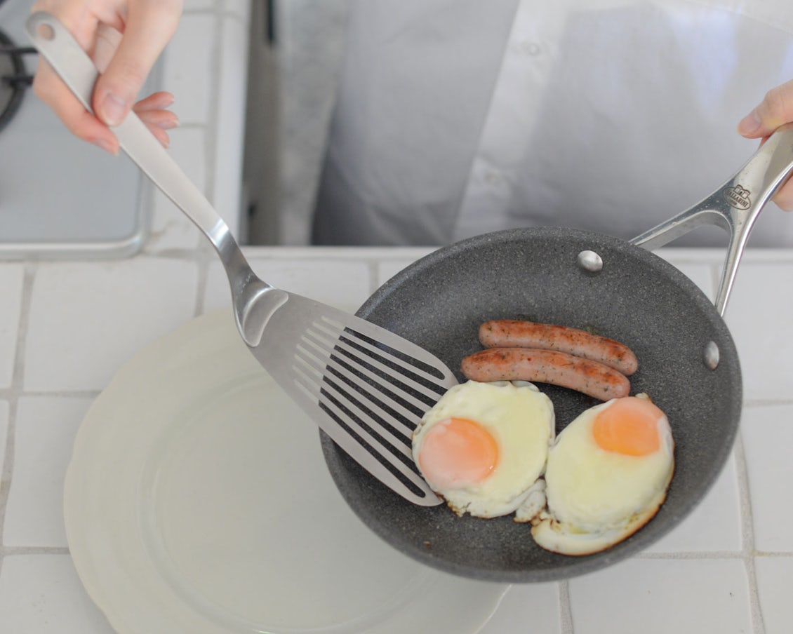 コーティングを長持ちさせるためには、木製や シリコーン製のキッチンツールがおすすめですが、丈夫で摩耗に強いので、金属製のヘラが使えるのも頼もしいポイント。