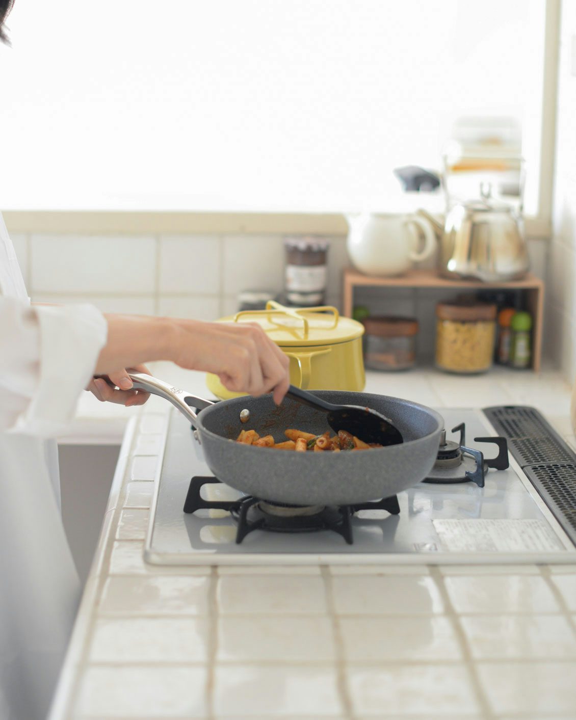 パスタなら1人前をゆったり作れますし、2人分のお野菜を炒めたり、朝食のスクランブルエッグを作ったり。深型より浅いので、焼き目をつけたいソテーなどにもおすすめです。