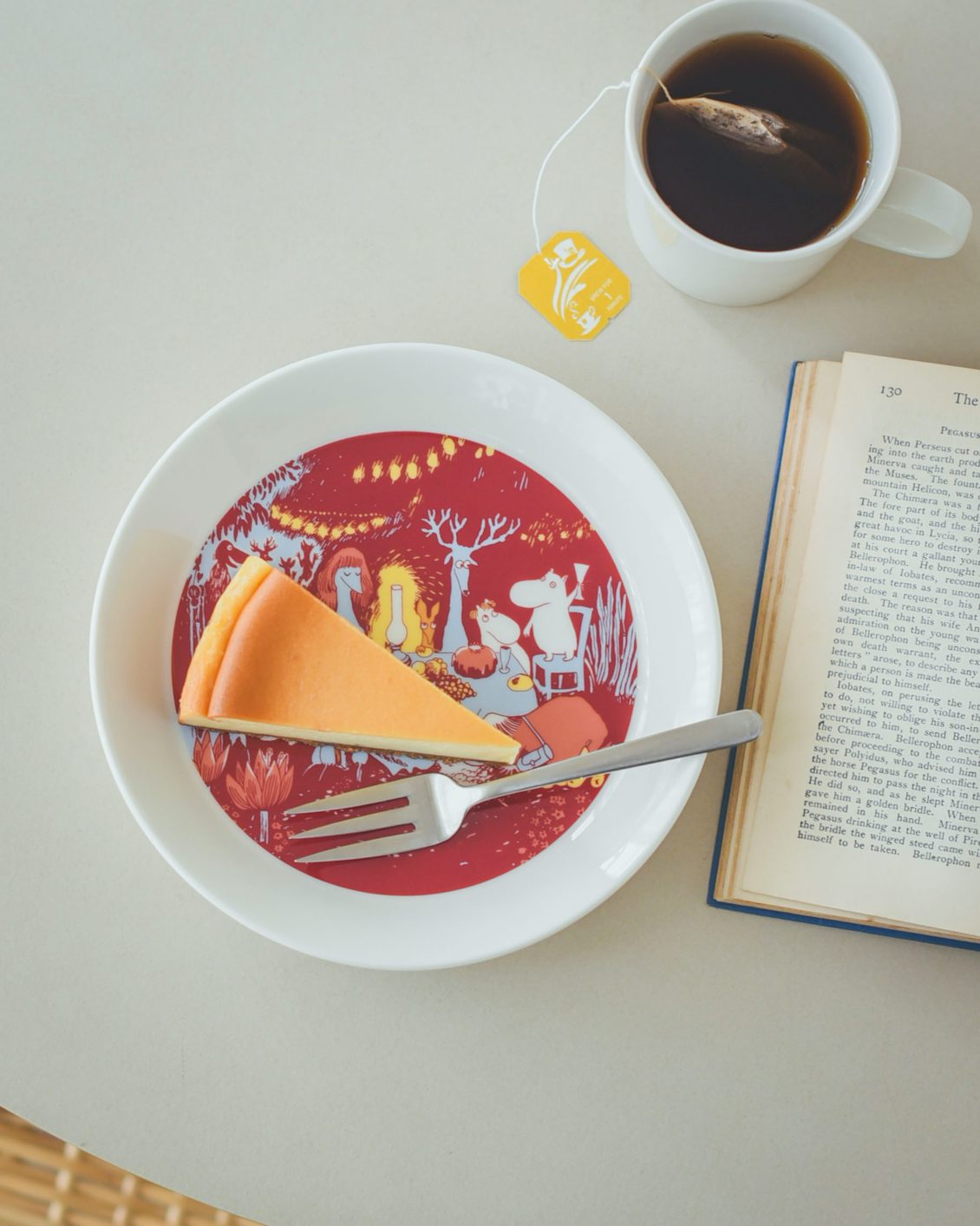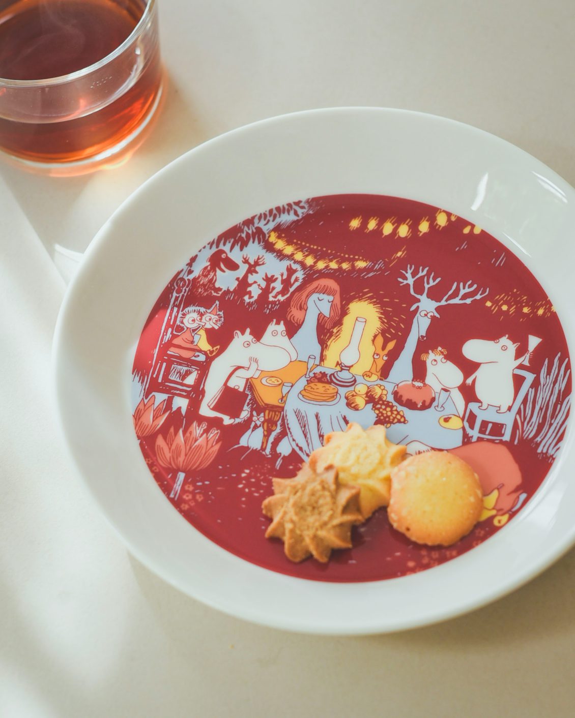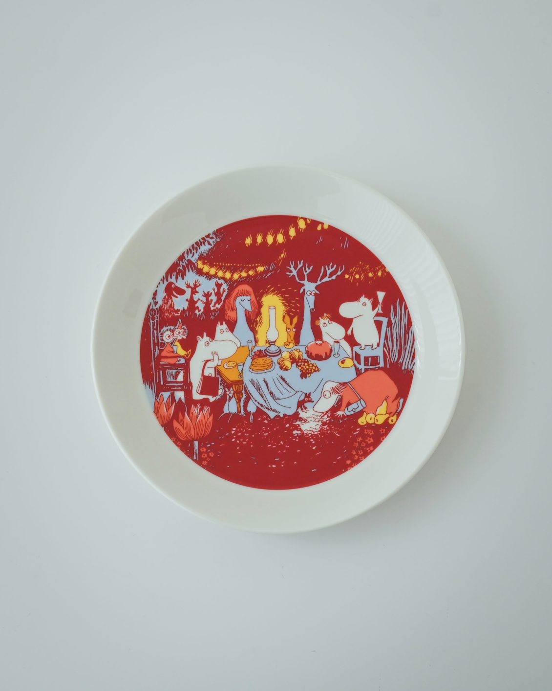 深みのある赤をベースに、イエローや淡いブルーをアクセントとした豊かな色使いが、ムーミンたちのお祝いムードをより一層高めているように感じます。