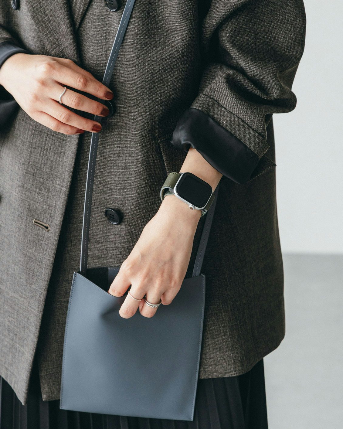 バンドのために選んだマットなレザーは、普段着と合わせてもラフな印象になりすぎず、ビジネスの場面ではほどよく品を添えてくれます。