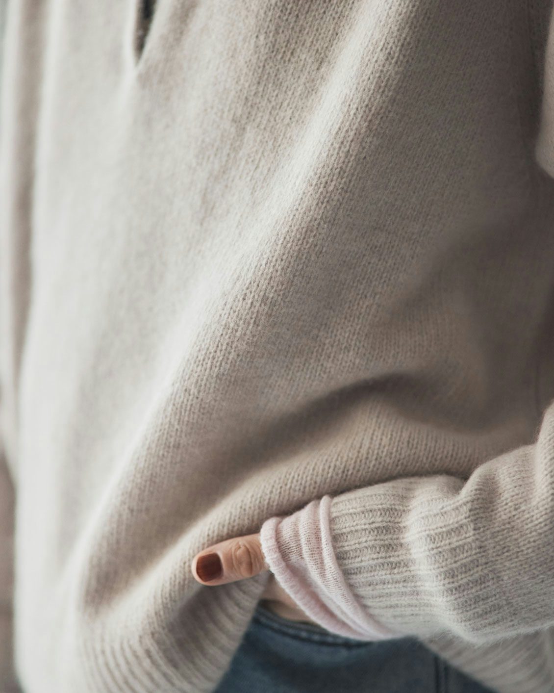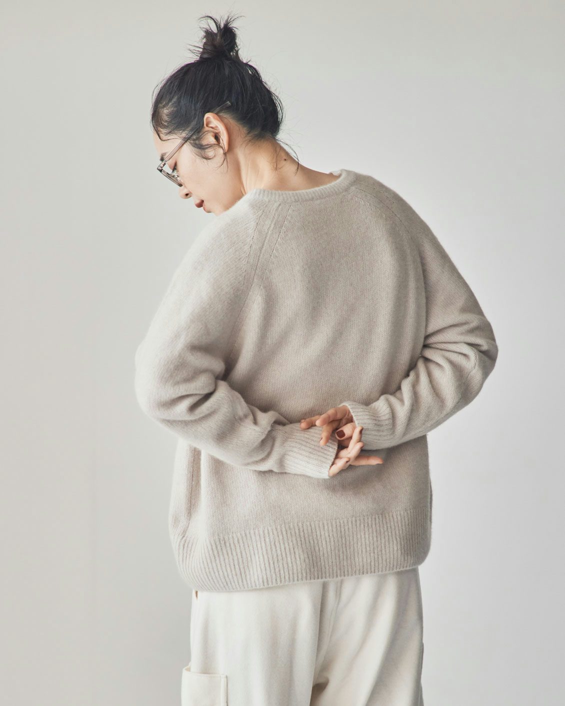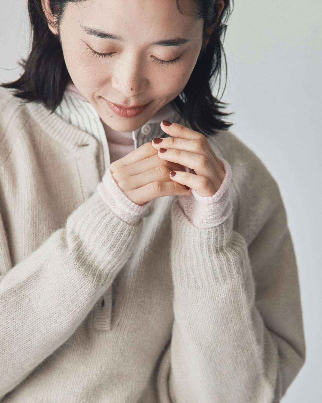 起毛感のある毛糸で仕立て、とにかく軽く、そして薄手で着膨れしにくいのもこのニットのポイント。それでいて、ちゃんとあたたかです。