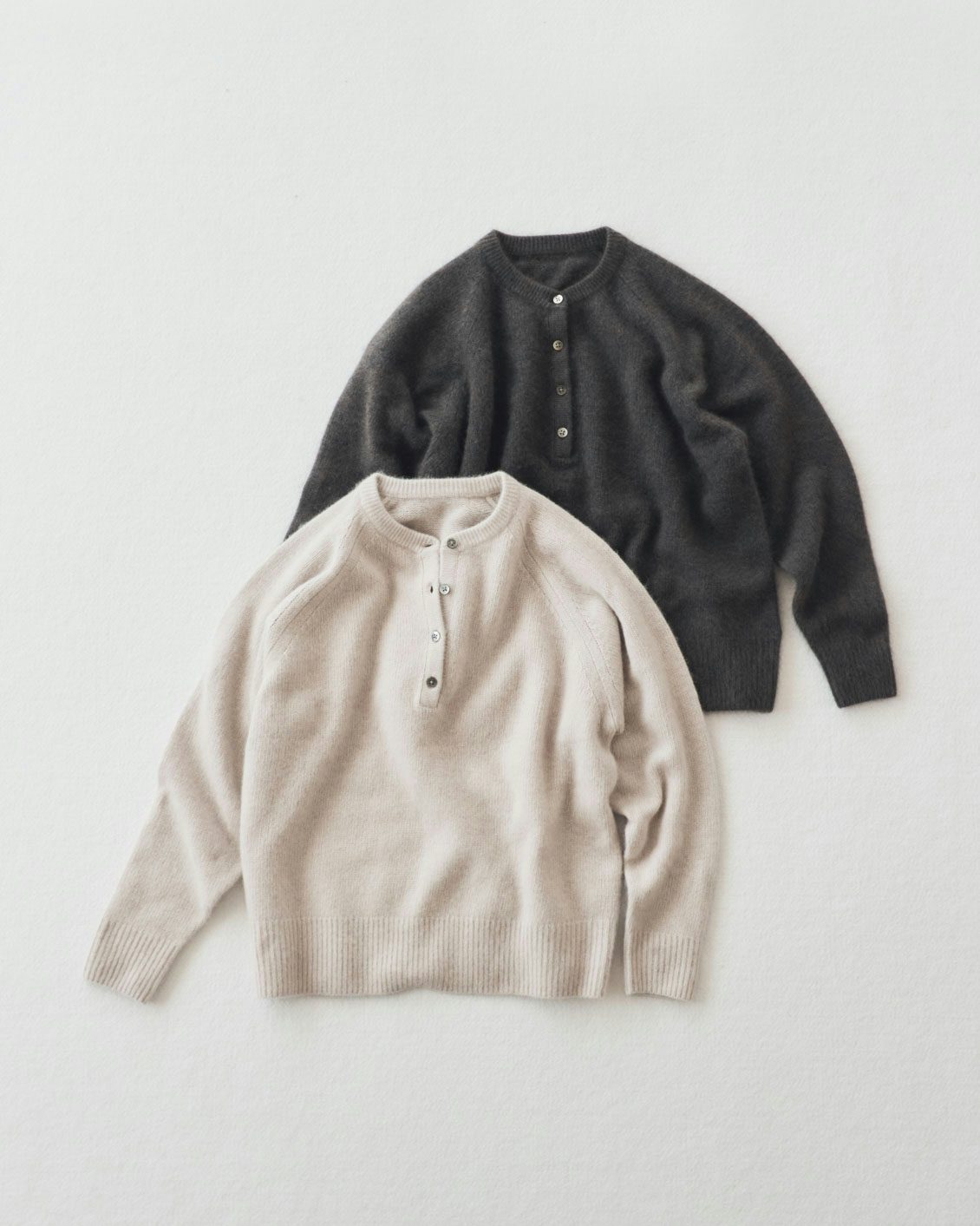 ふんわり素材のヘンリーネックニット(エクリュ、チャコール)