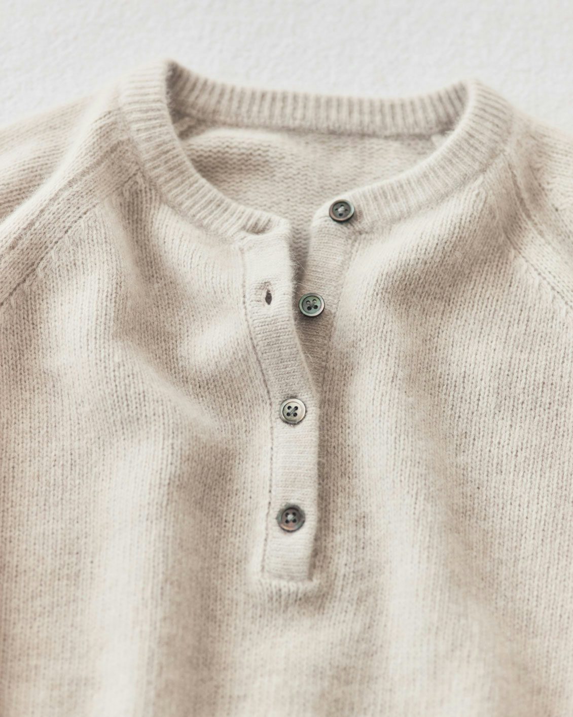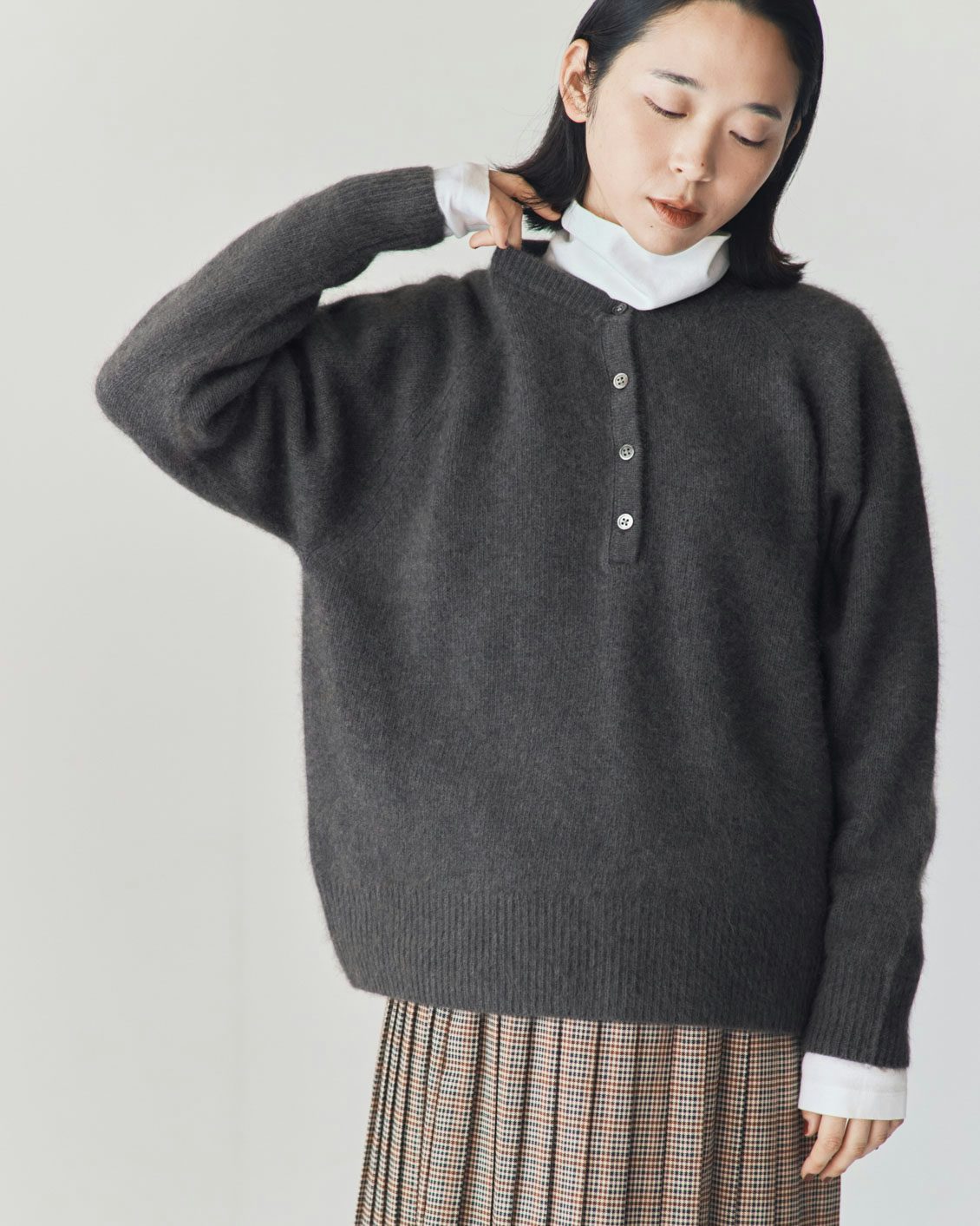 このニットのポイントは、胸元までボタンのついた「ヘンリーネック」のデザイン。
