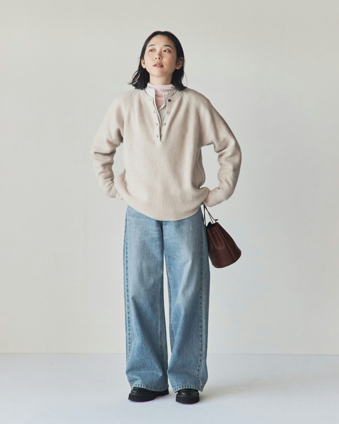 「ヘンリーネック × 程よいゆったりシルエット」の掛け合わせの妙で、ワンマイルからお出かけまで、とにかく使えるこのニット。
