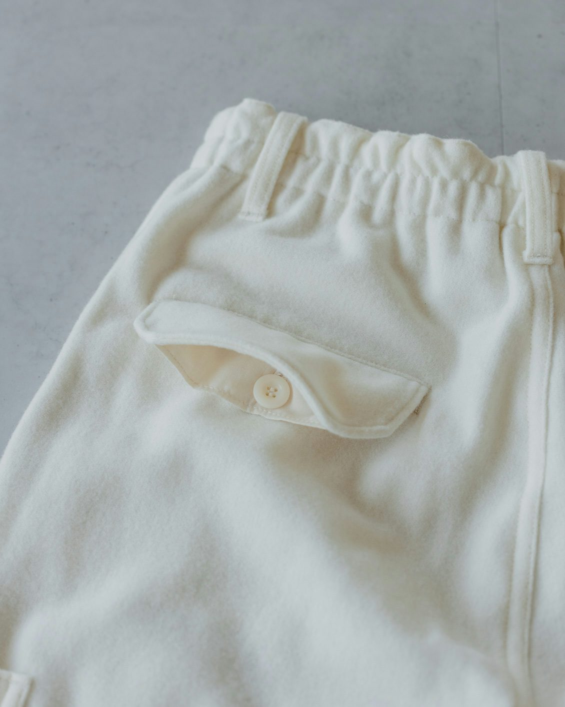 カジュアルなカーゴパンツを品よく、そして暖かく着られるように、選んだのはウールフラノです。