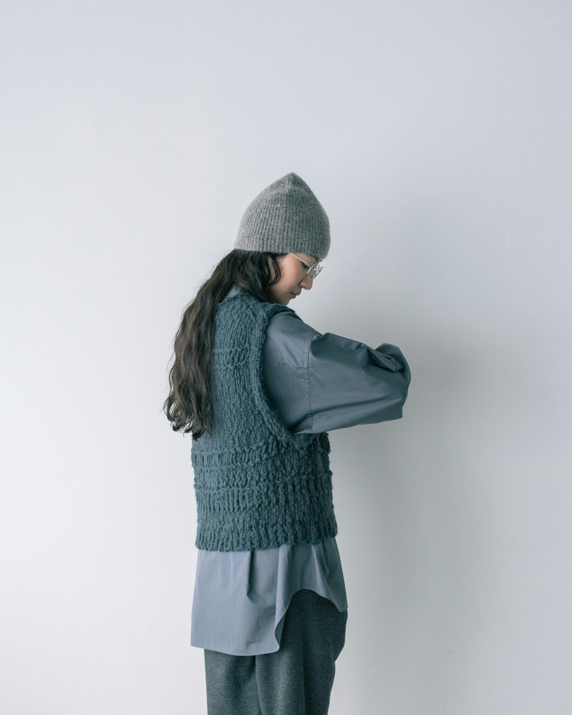 糸の表情が際立つよう編みあげたニットベストは、華やかさだけでなく、デイリーに重宝する優れものです。
