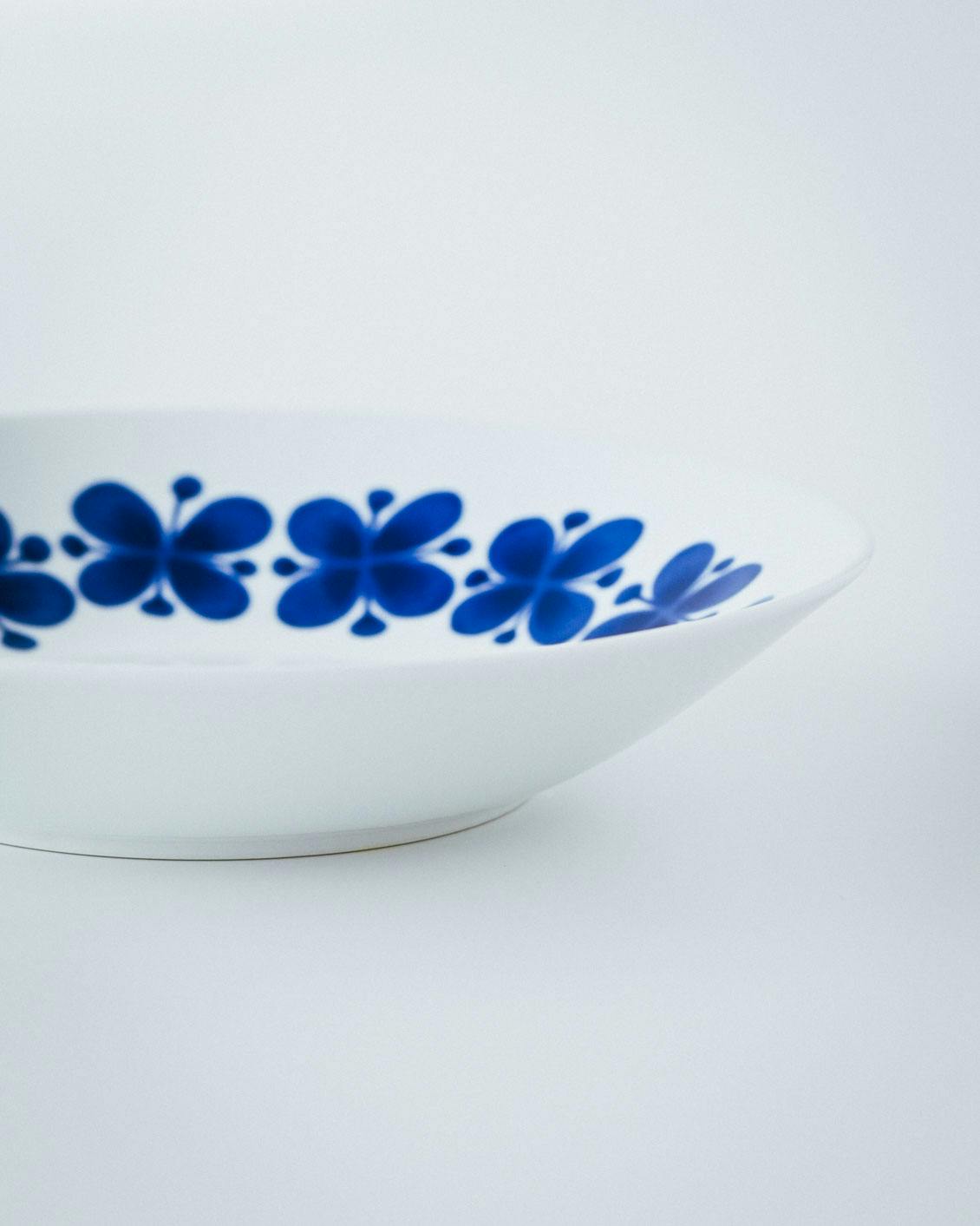 パッと目をひく深いブルーの花模様に秘められた愛らしいメッセージに、眺めているだけで幸せな気持ちをもたらしてくれるような器です。