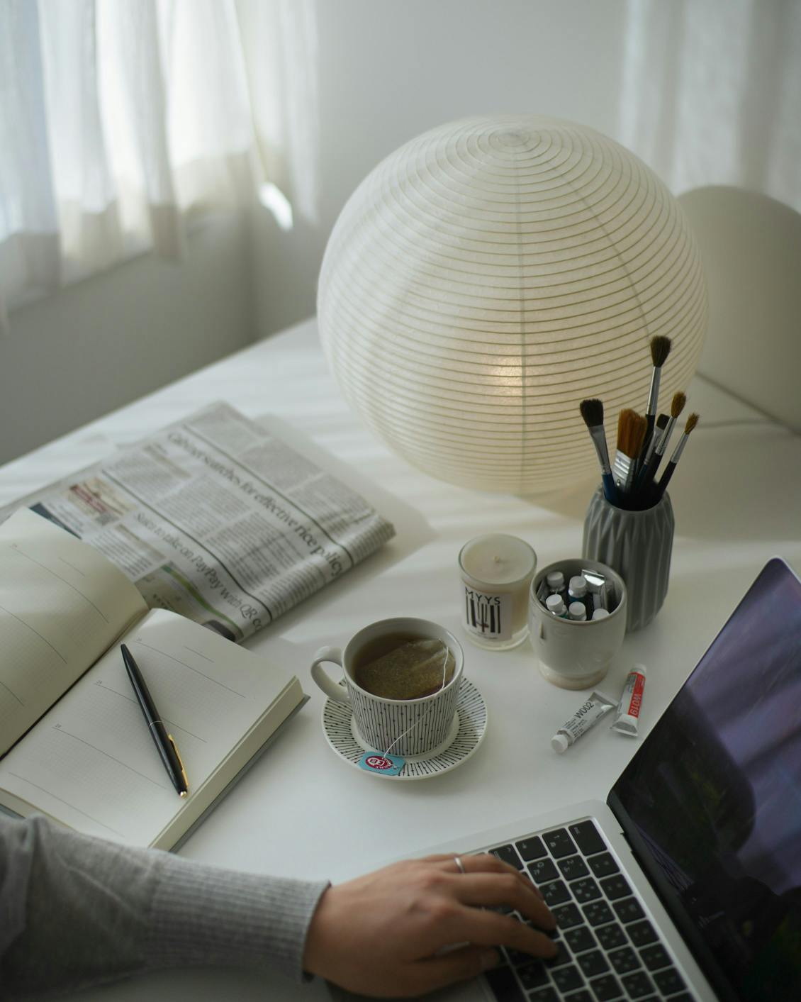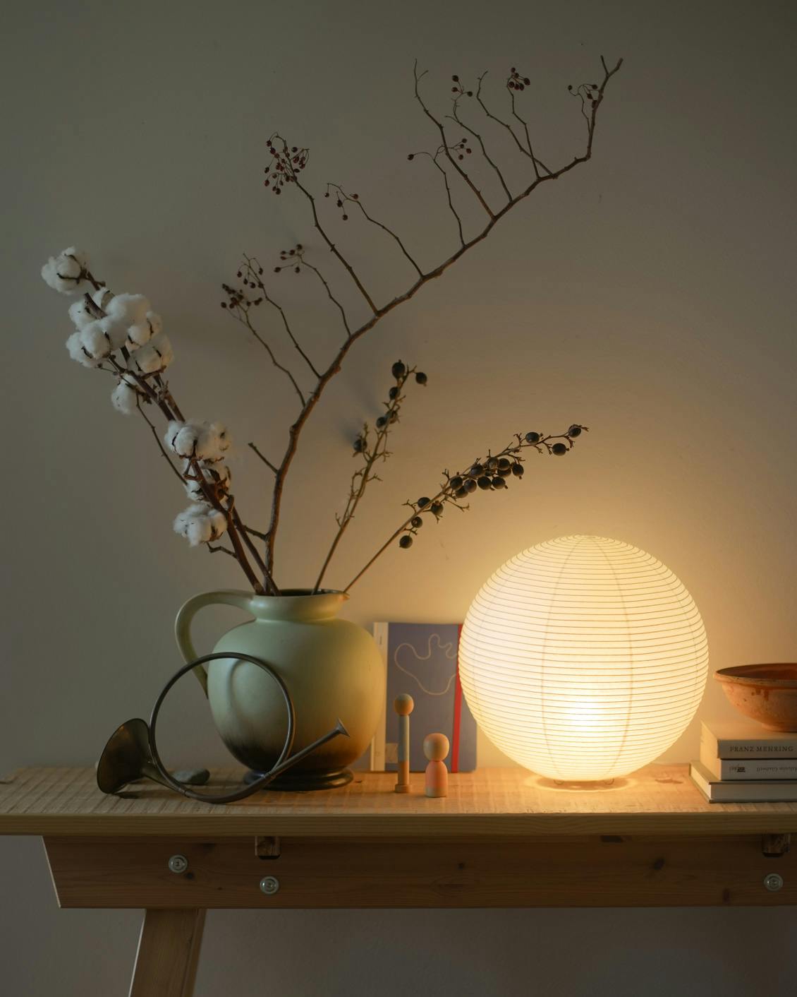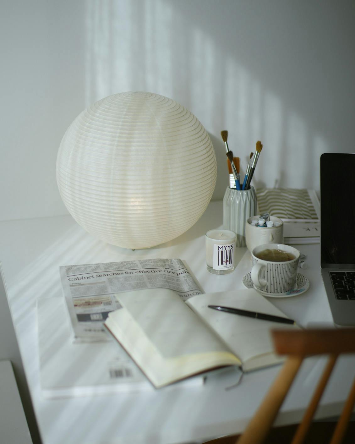 シェードは優しい生成り色。日中は自然光でやわらかな陰影が生まれ、オブジェとしても楽しめます。