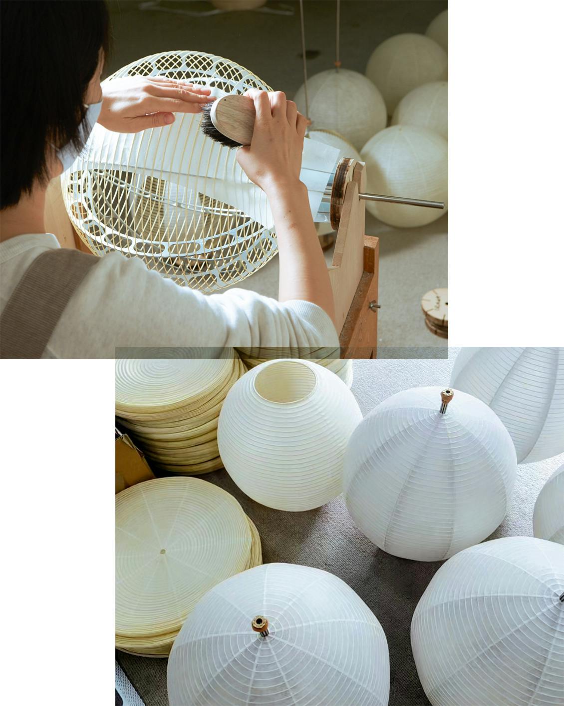 型に細い骨材を巻き、ごく薄い和紙を貼り付ける作業は、熟練の職人だからこそ成せる技。