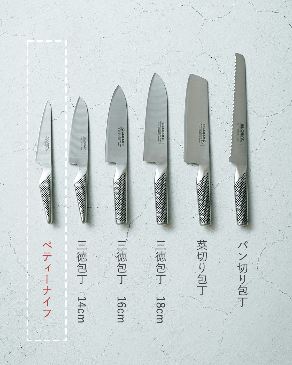 こちらのページでご紹介した「ペティーナイフ」の他に、当店取り扱いのGLOBAL包丁は全6種類。