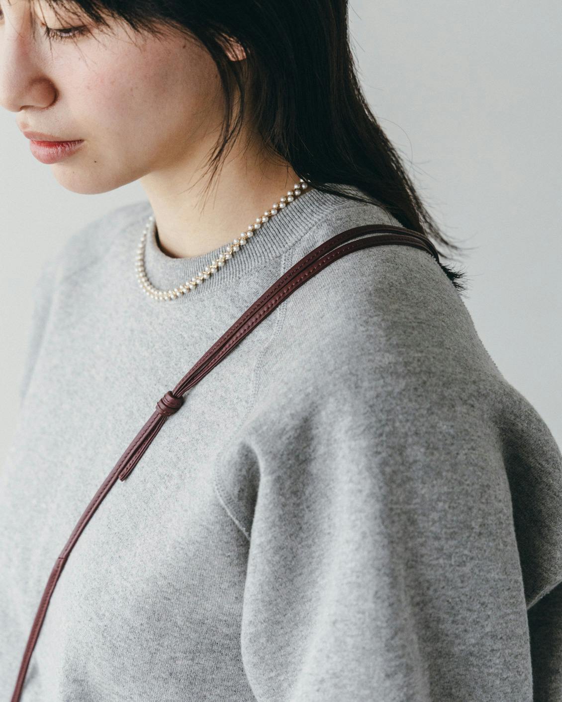 肩に当たる部分が二重になっているので重さが分散され、ストラップは細く華奢な印象のまま、肩に食い込みにくく、やさしい掛け心地になっています。
