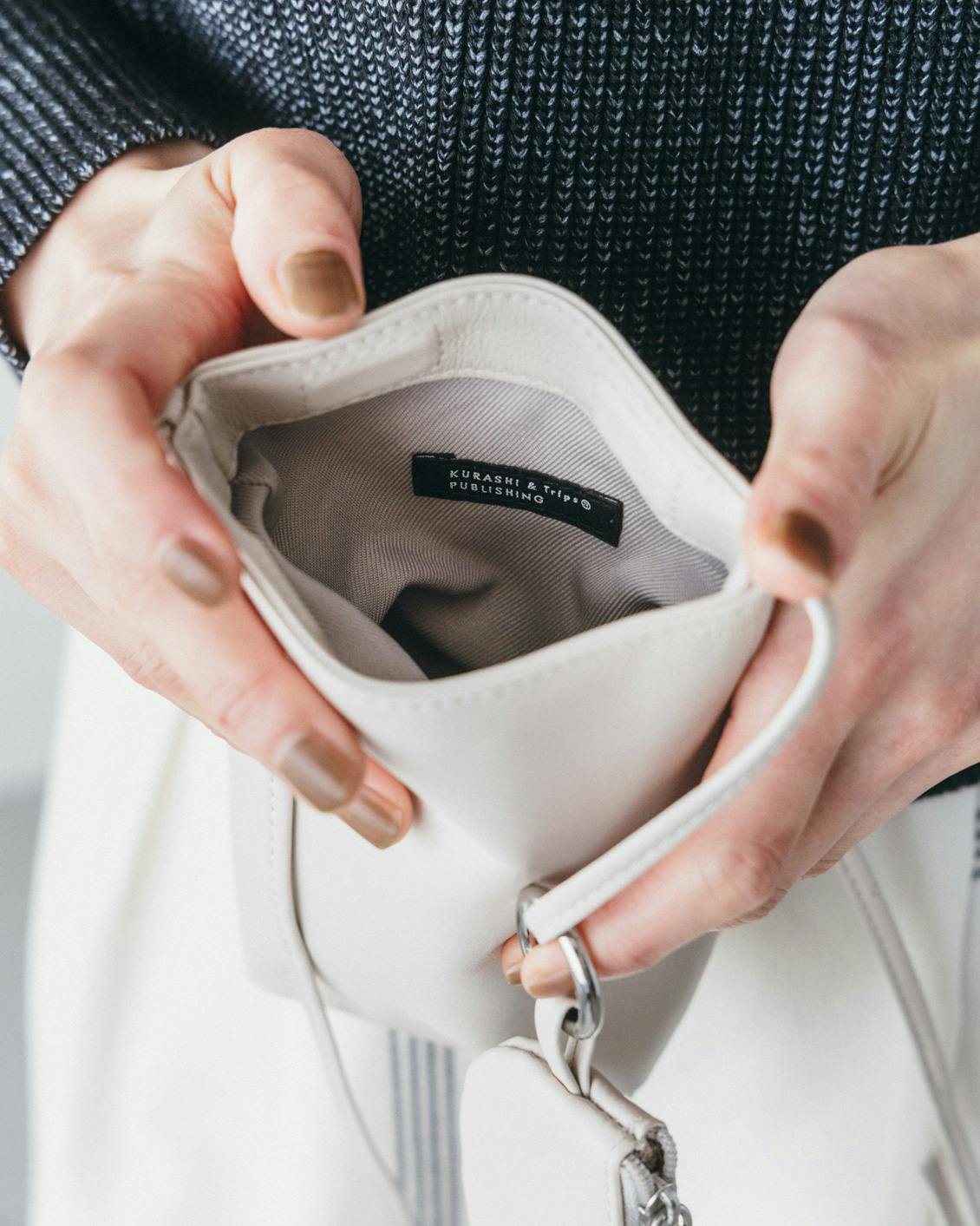 ミニポーチはファスナー以外は縫製を表に出さず、つるんとニュートラルな印象にしました。細部までこだわって、上品な佇まいを形にしています。