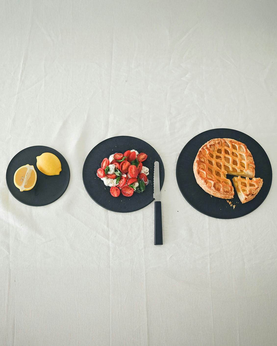 ブラック は、いつもの料理をのせるだけで凛とした印象に。食材の色や輪郭をすっと引き立てるから、料理が映える間違いのないカラーです。