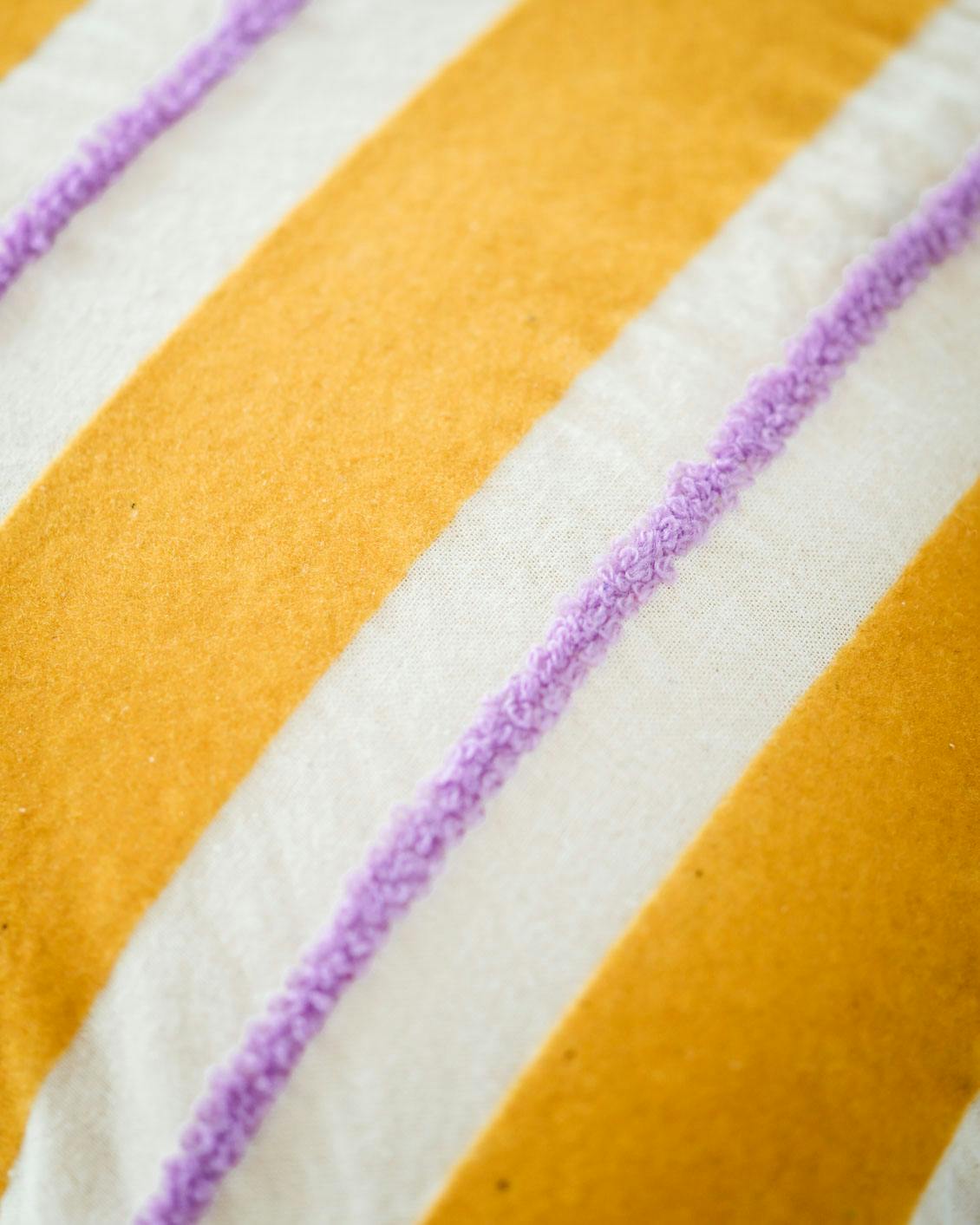 キャンバス生地にストライプのフロッキープリントと、パープルの糸でふわっと立体感のある刺繍が施されています。