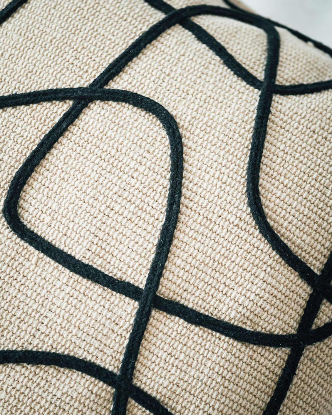 ハンドメイドで織られた生地の上に、テープ状の不規則なラインが刺繍で施された抽象的な絵柄です。