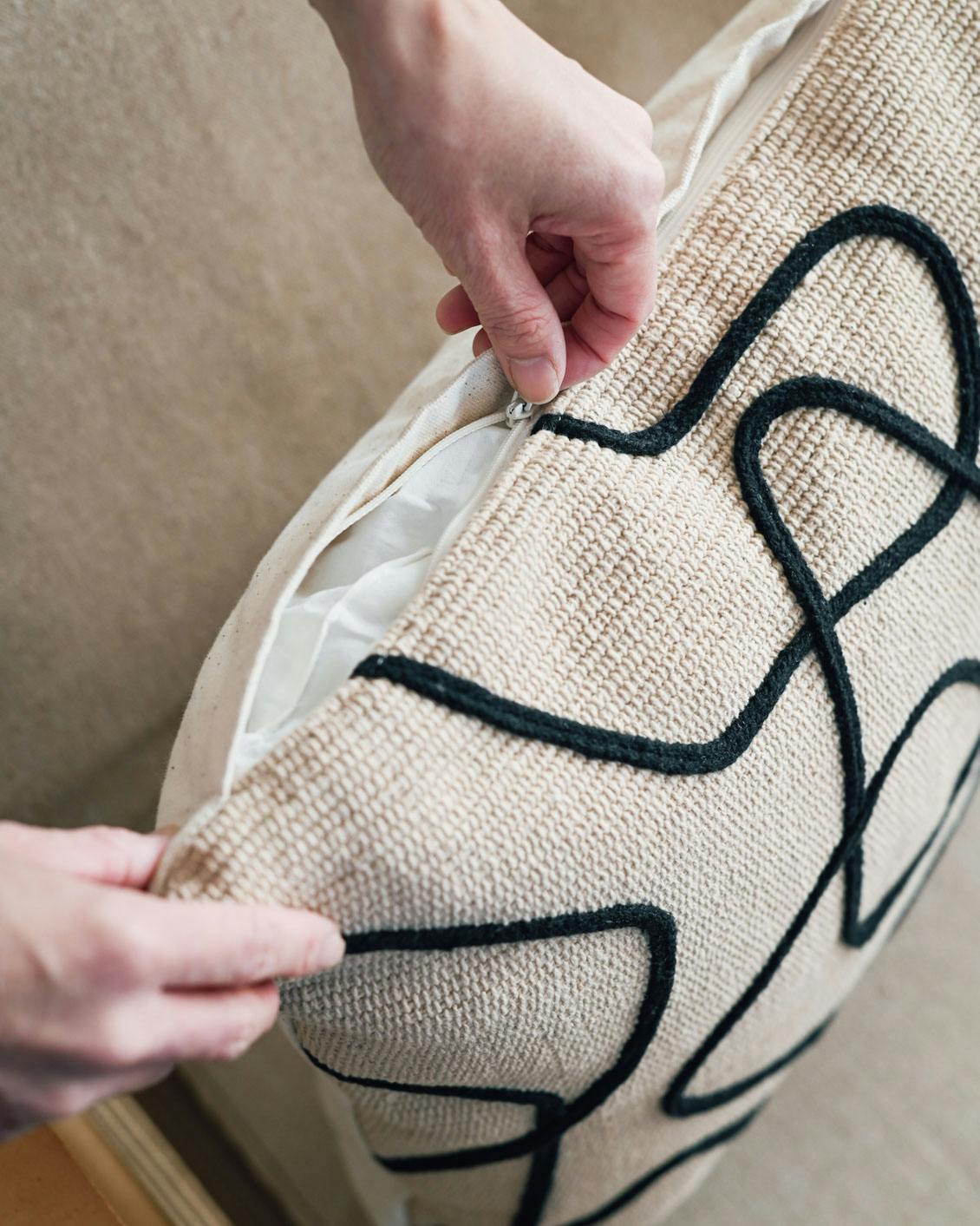 ファスナーの間口はカバー自体の幅よりも小さめになっているため、クッション中材を入れる際はつぶしながらゆっくりと入れてください。