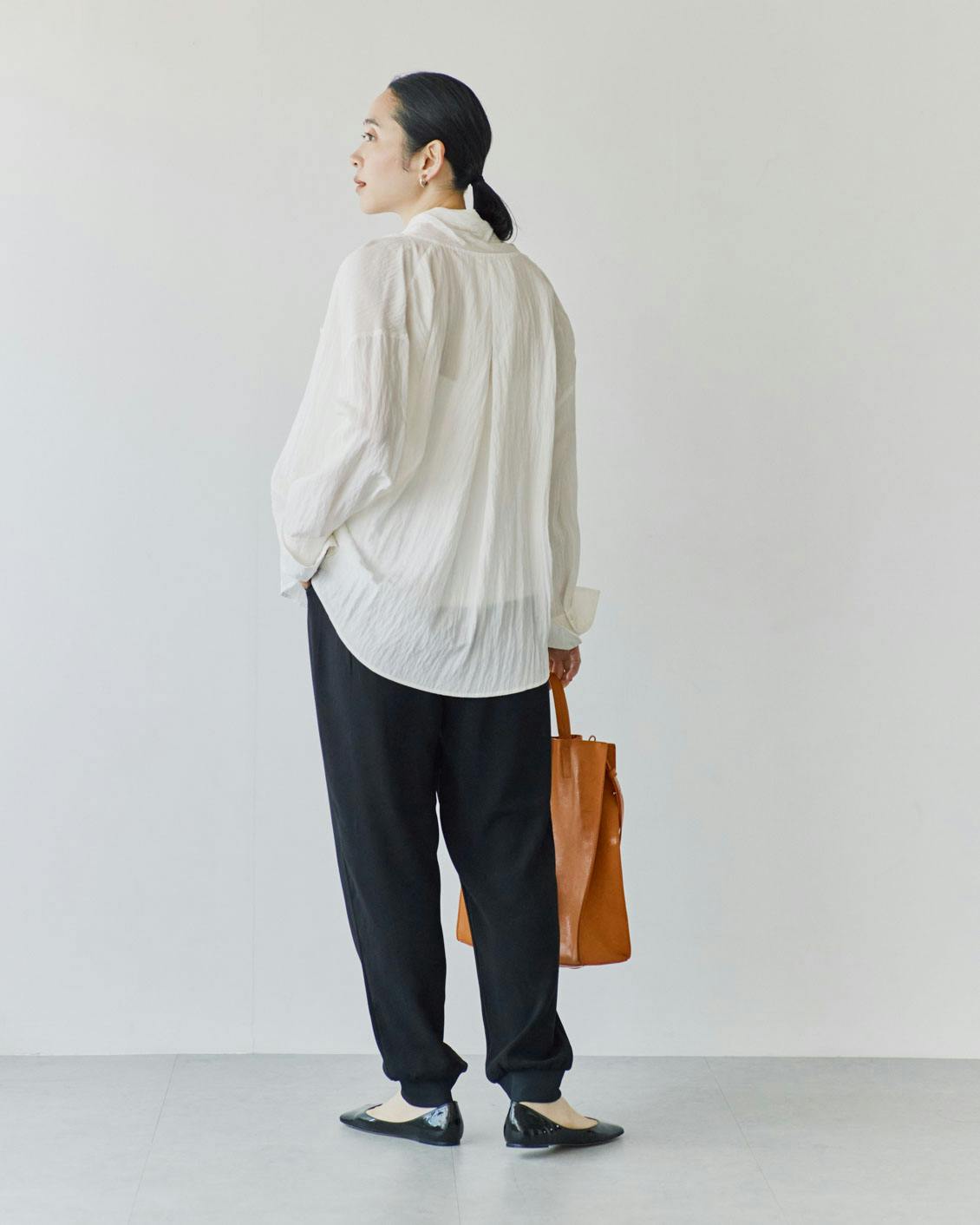 ブラウスやジャケット、レザーの小物を合わせたら、きれいめに装いたい日にもぴったり。スラックスのような品の良さが漂います。
