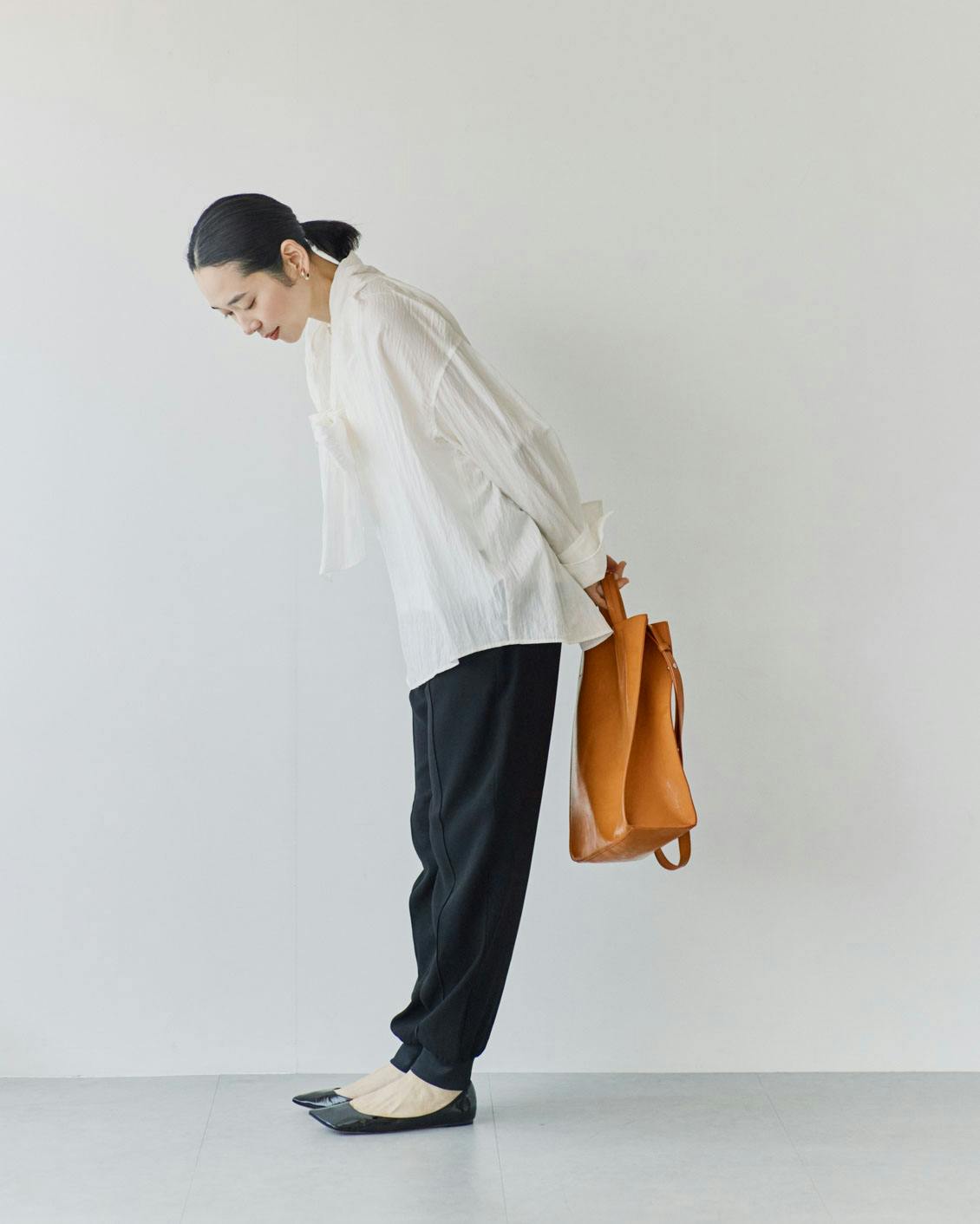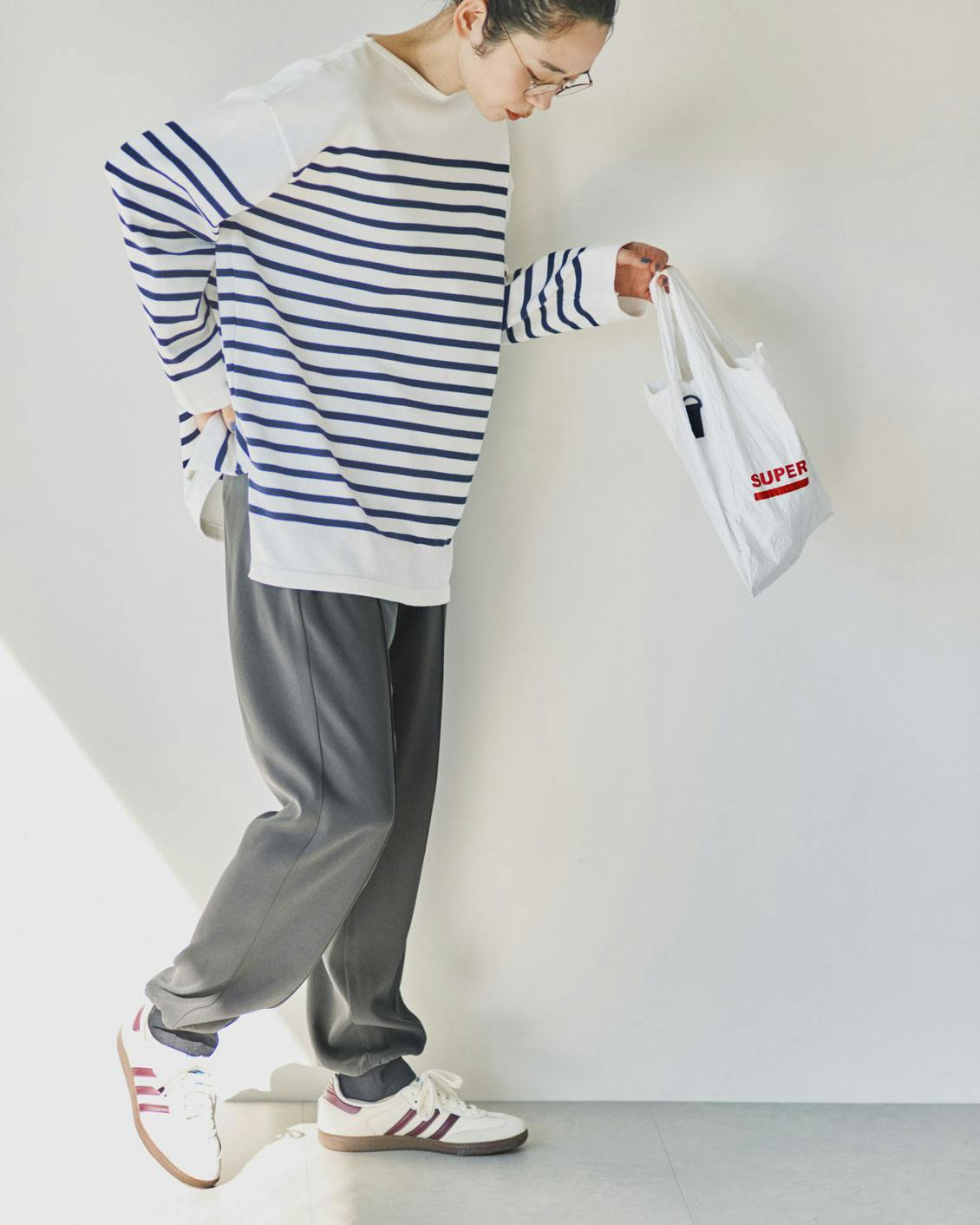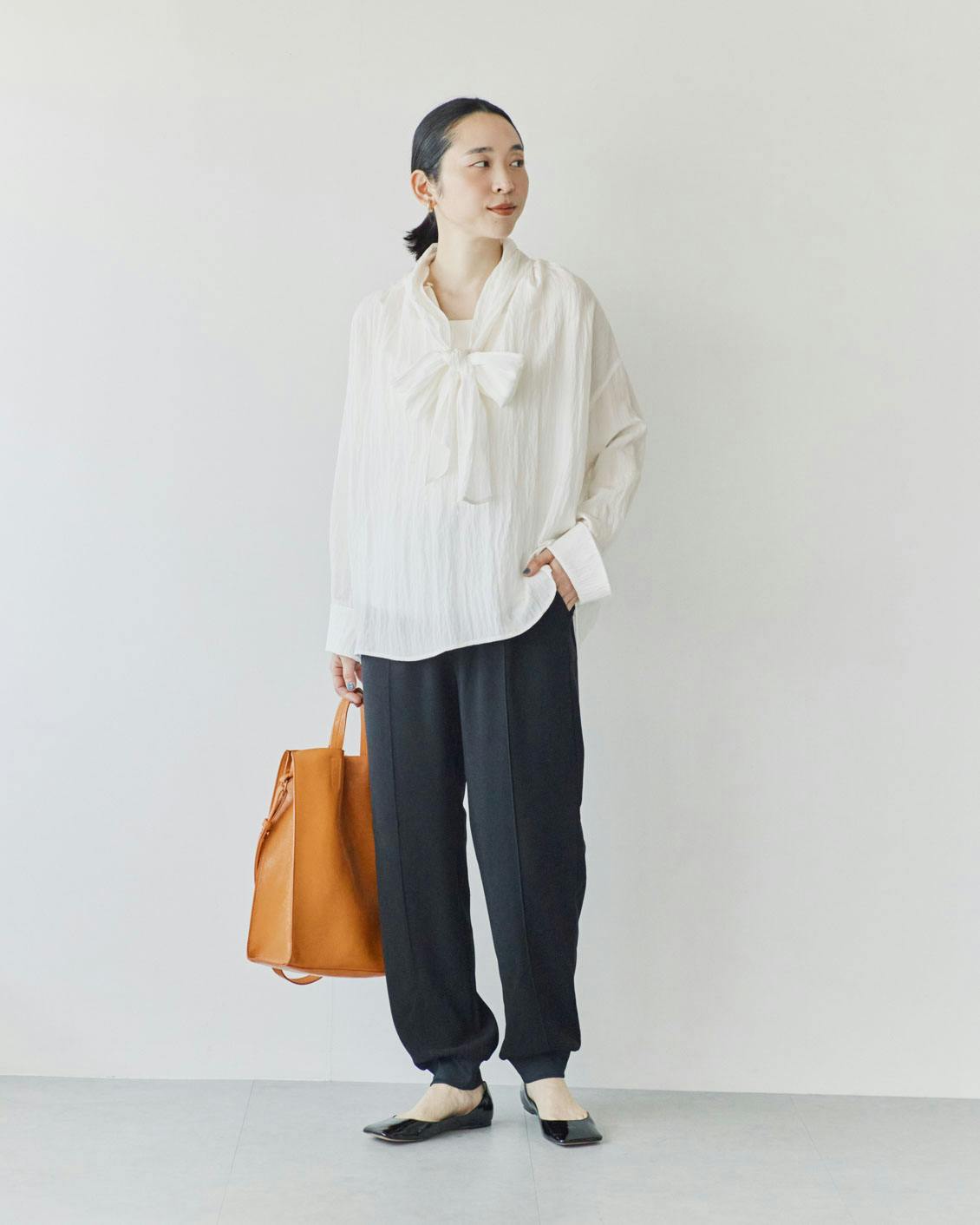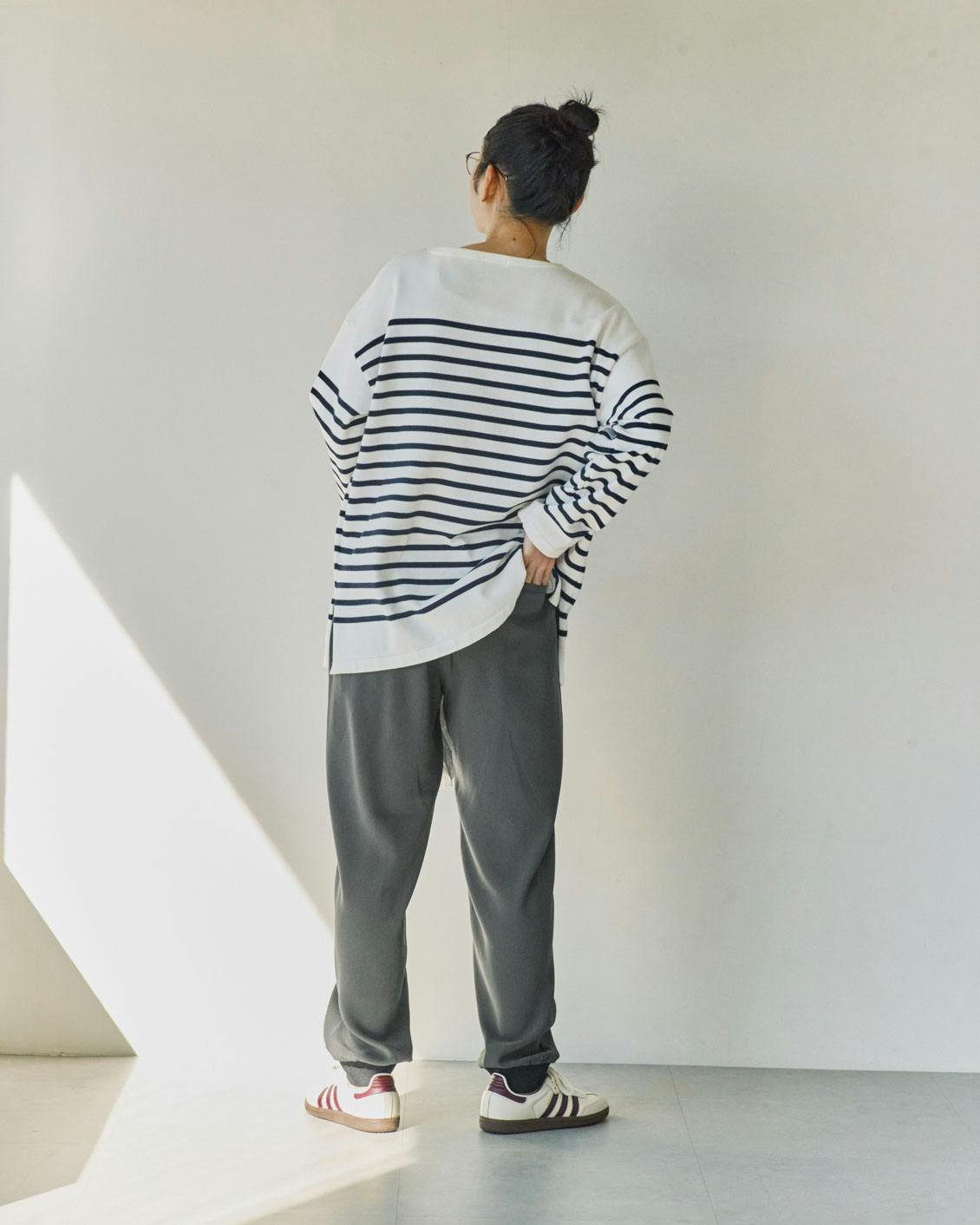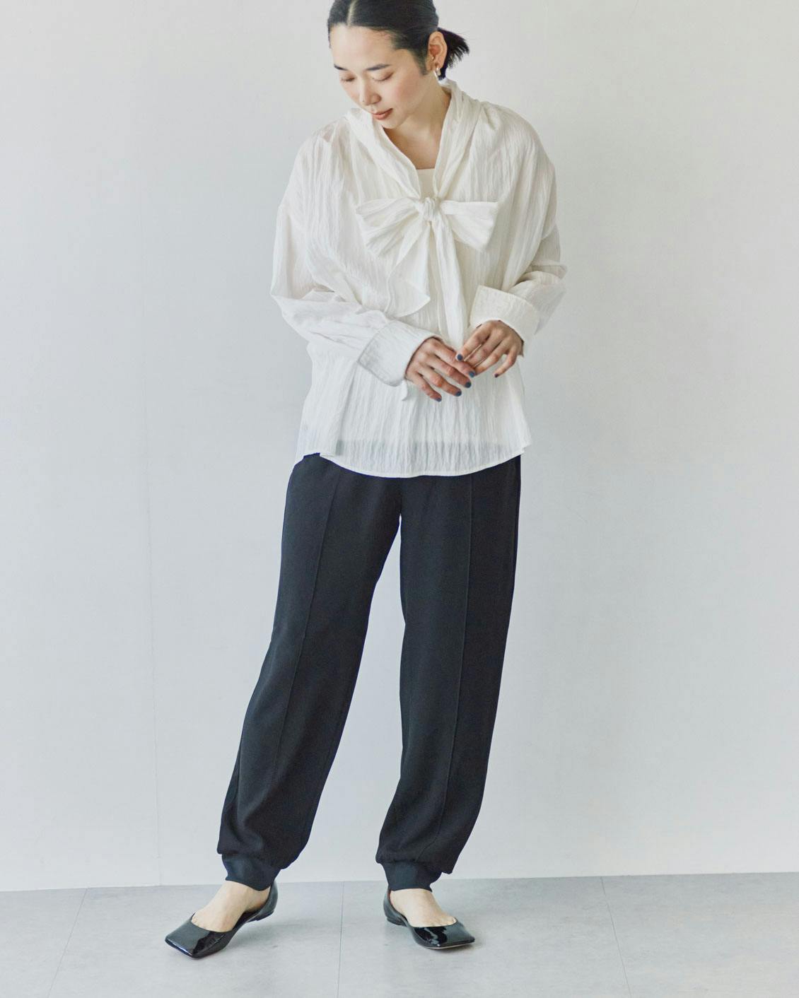 もちろん、コンパクトなトップスも相性良し。すらっとしたパンツのシルエットが引き立ち、脚長効果もあるんです。