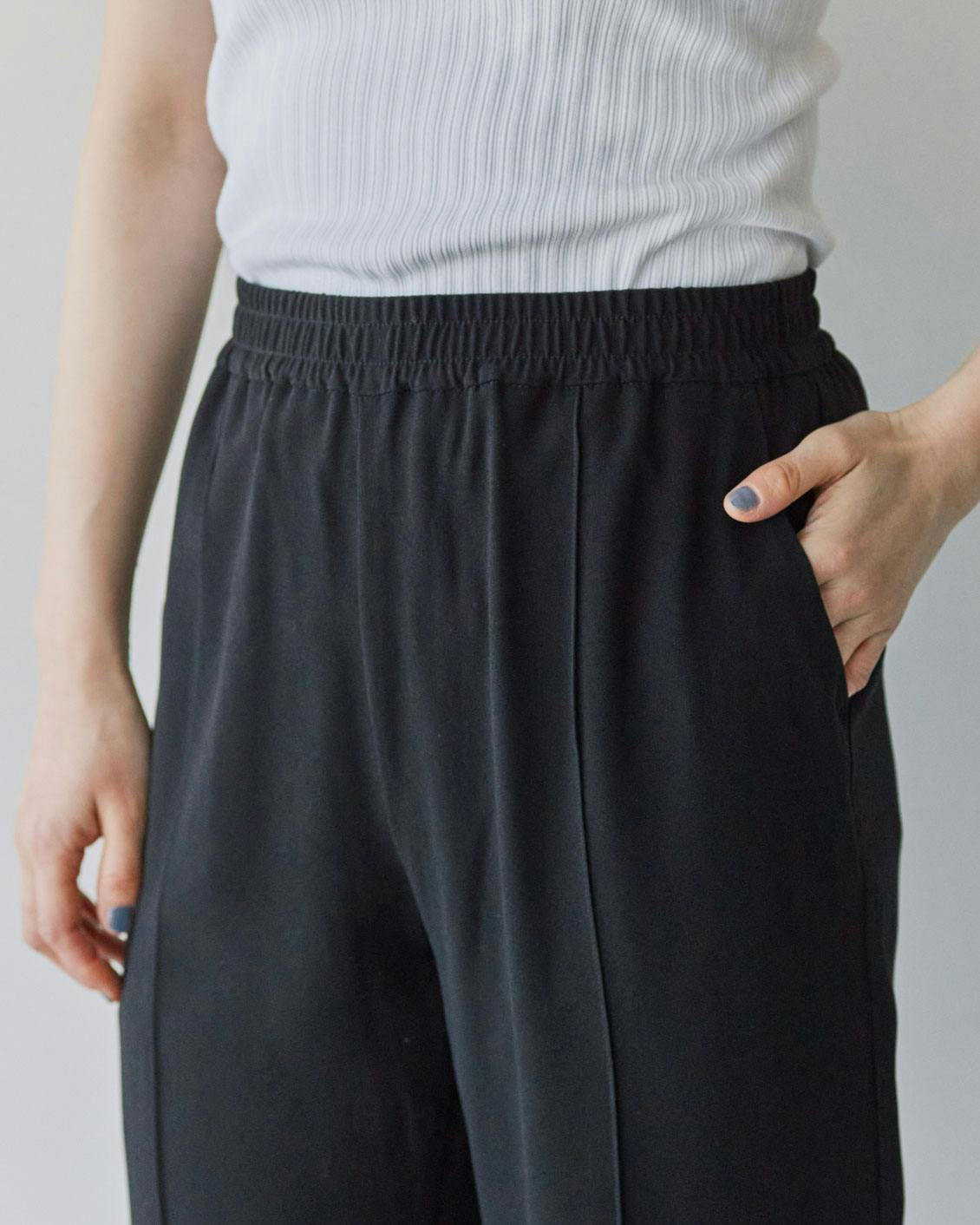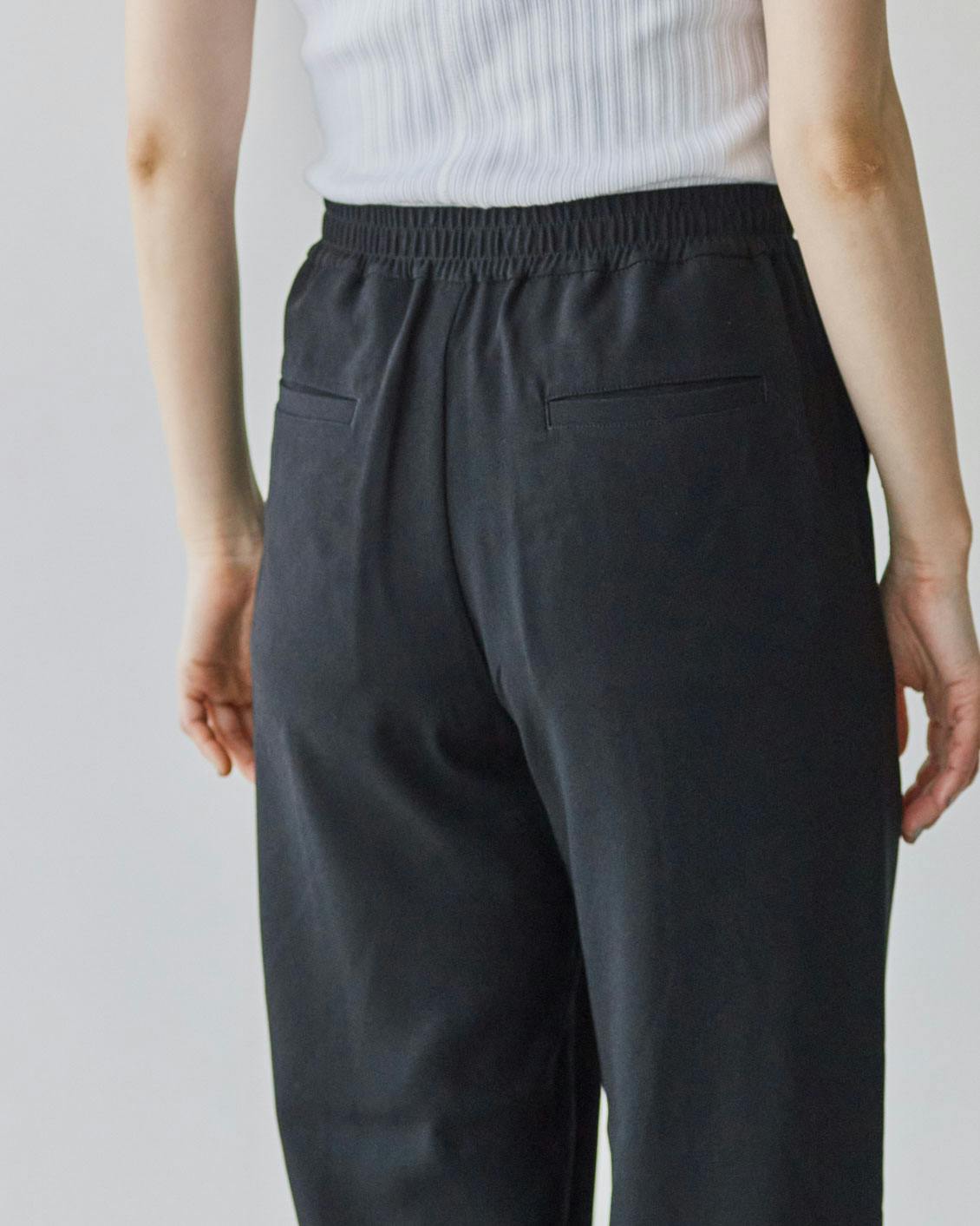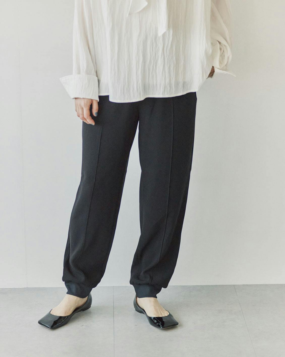 体のどこにも締めつけがなく、動きやすいジョガーパンツの良さはそのままに。おしゃれしたい日も気後れなくはける、大人にちょうどいい一着に仕上がりました。