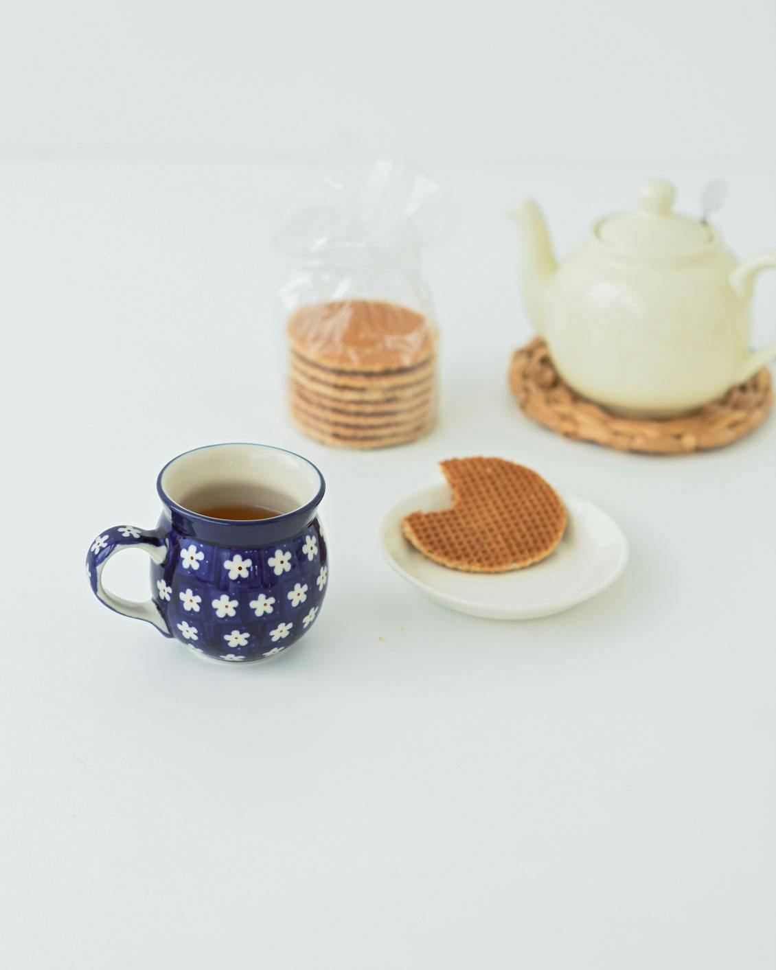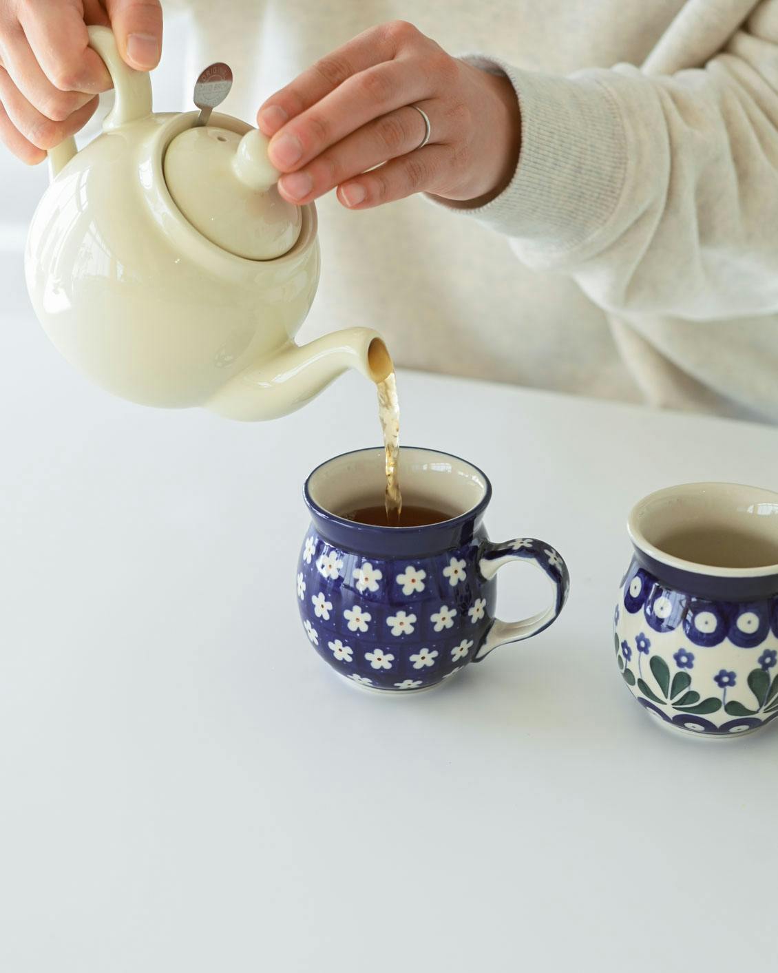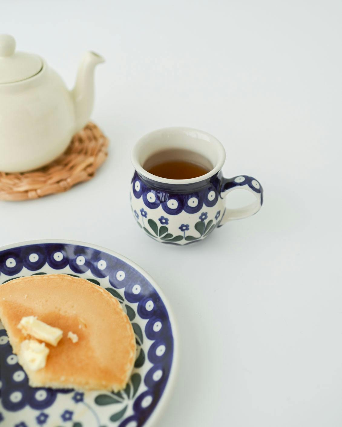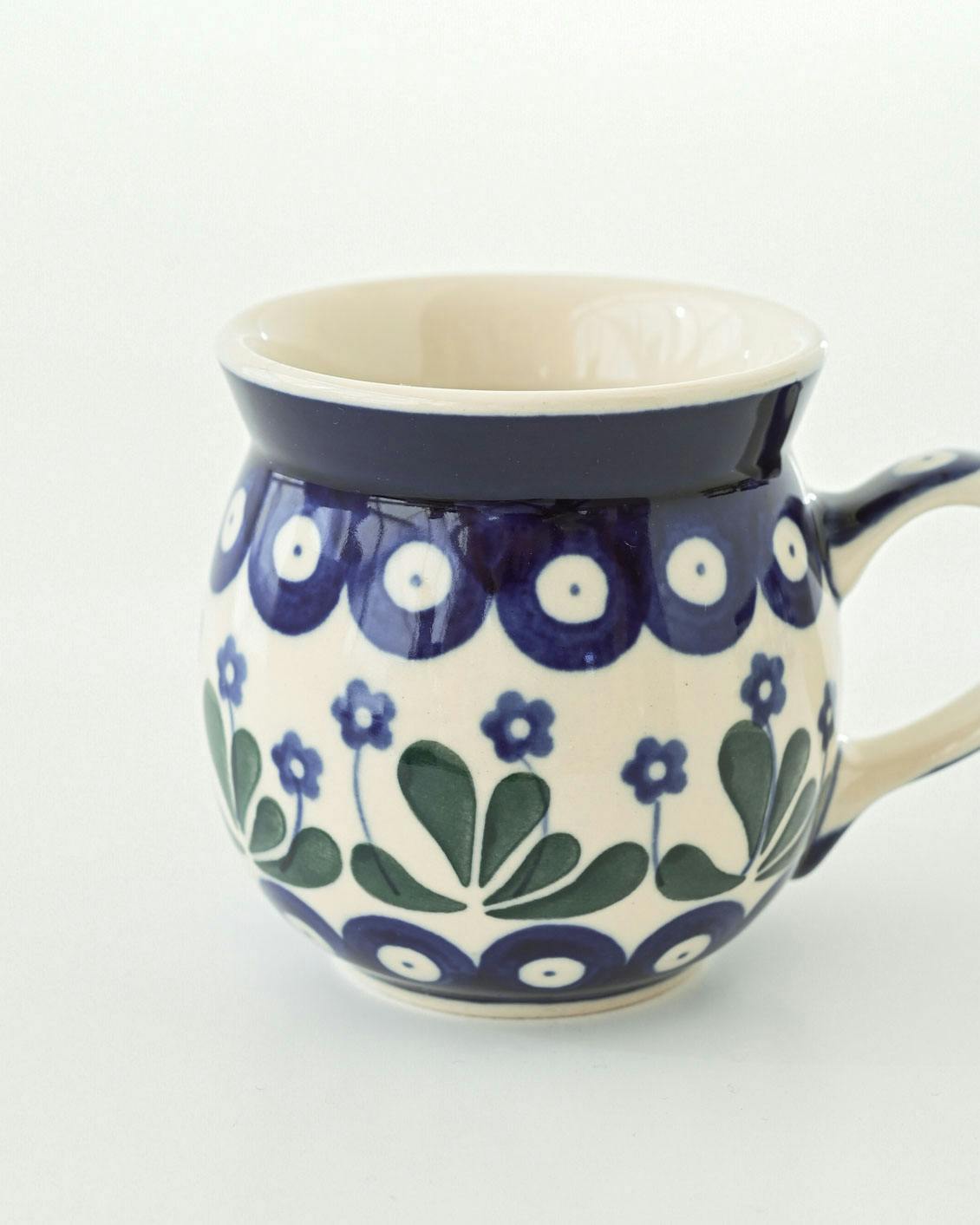 このマグカップの特徴は、ぽってりと厚みのある質感と、独特な「つぼ型」のフォルム。ポーランドの厳しい寒さを乗り越えるための工夫から生まれたかたちなのだそうです。