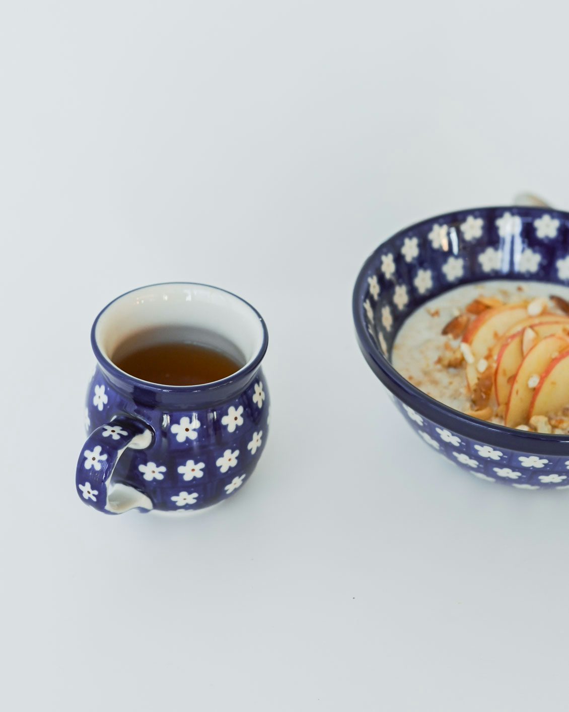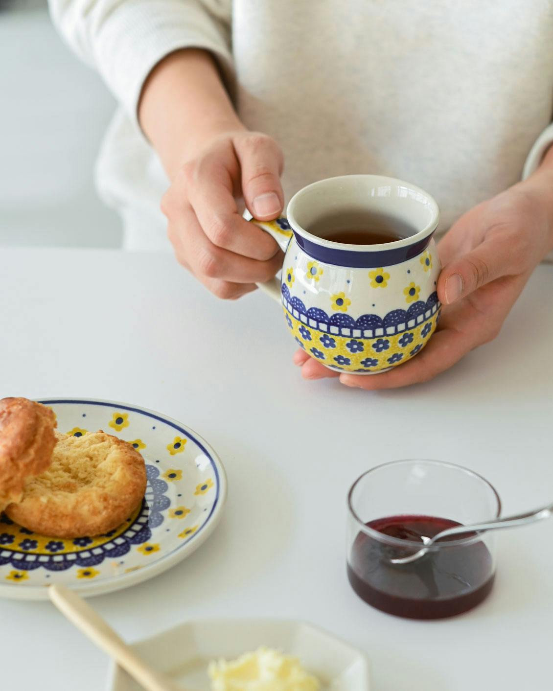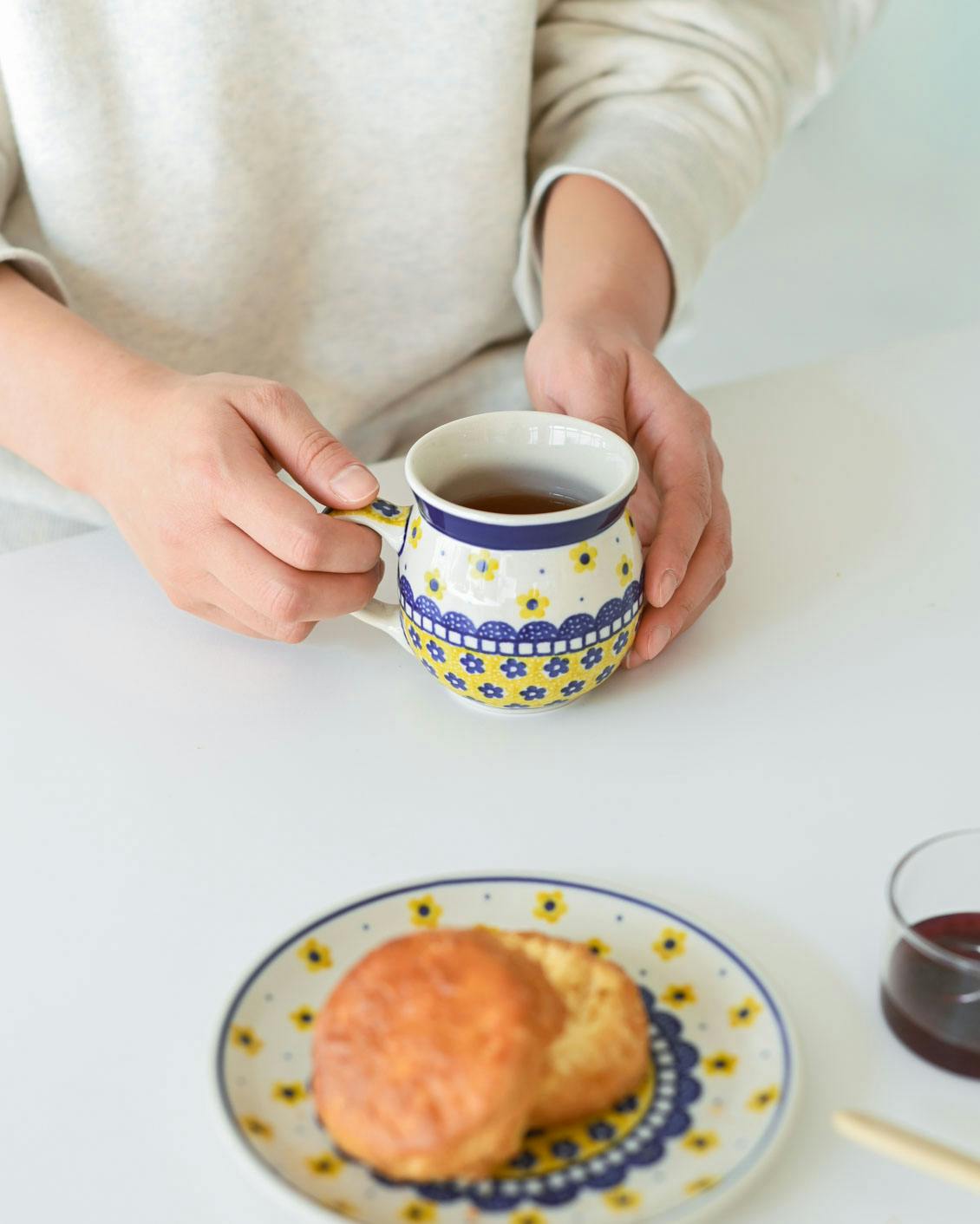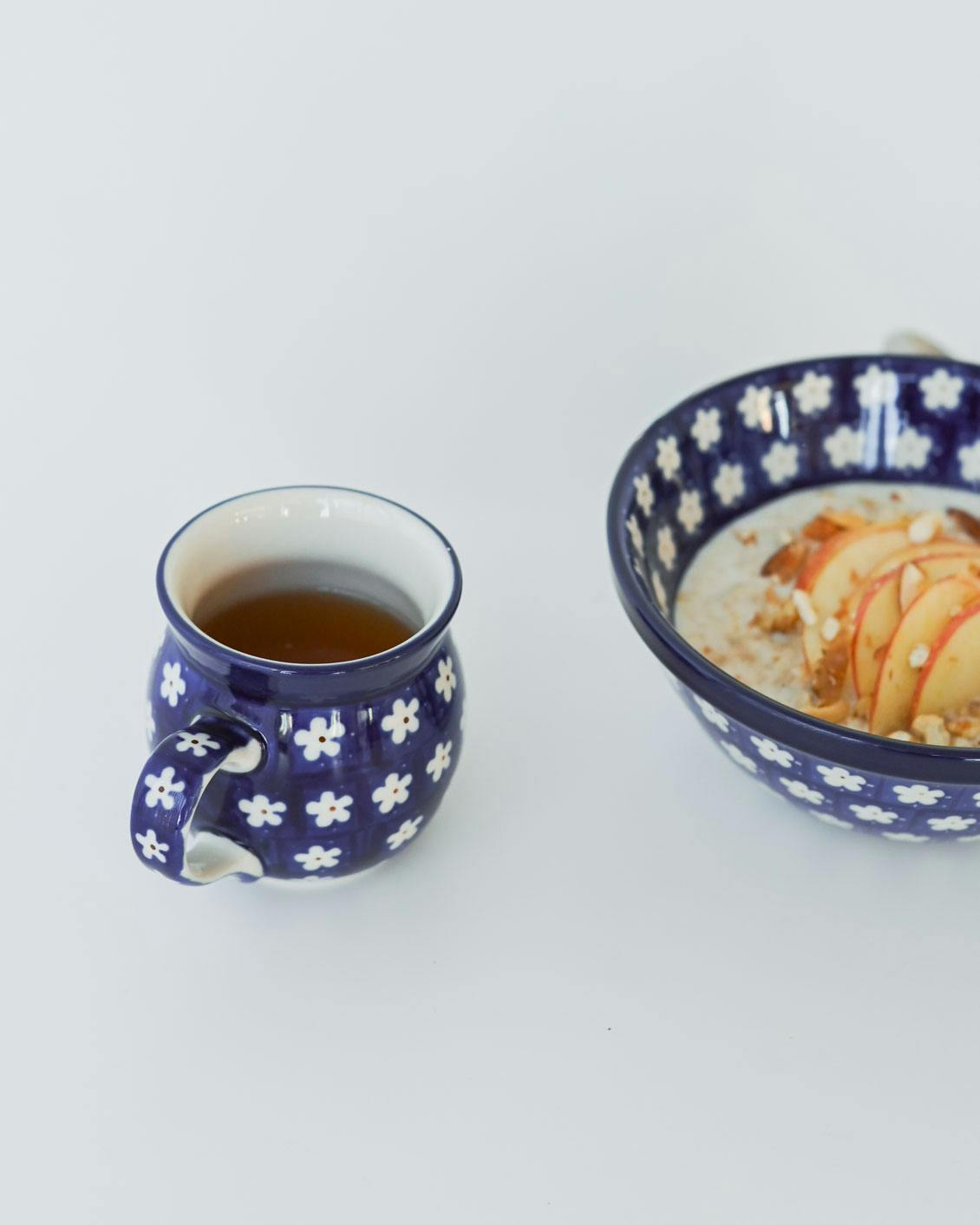 このマグカップの特徴は、ぽってりと厚みのある質感と、独特な「つぼ型」のフォルム。ポーランドの厳しい寒さを乗り越えるための工夫から生まれたかたちなのだそうです。