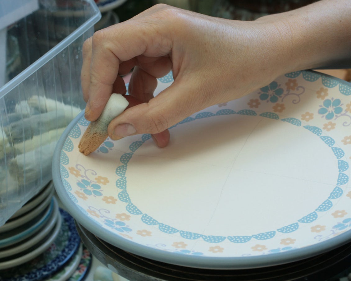 一面に隙間なく、ぎゅぎゅっと描かれた模様たち。これらはすべて、熟練の職人が手作りのスポンジスタンプを使い、丁寧に絵付けしたものです。