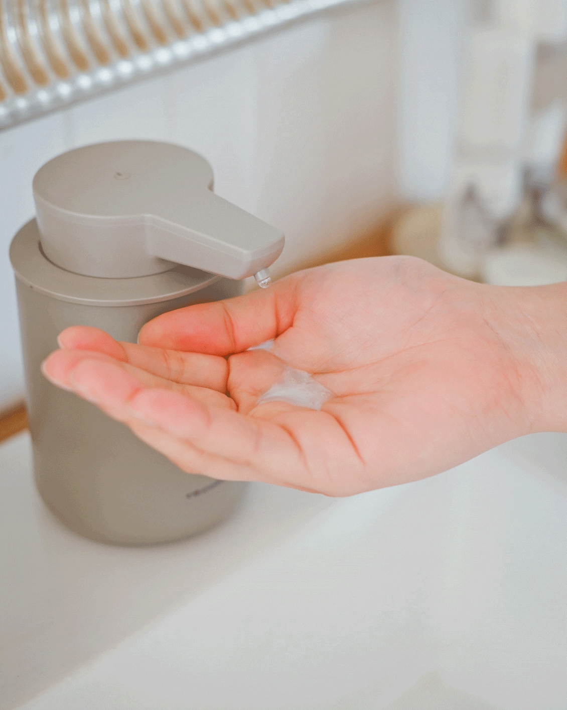 手を差し出すだけで高感度センサーが感知し、自動でハンドソープが出てくる設計。ボトルや洗面台が汚れないので、お手入れの手間もぐっと減らせます。