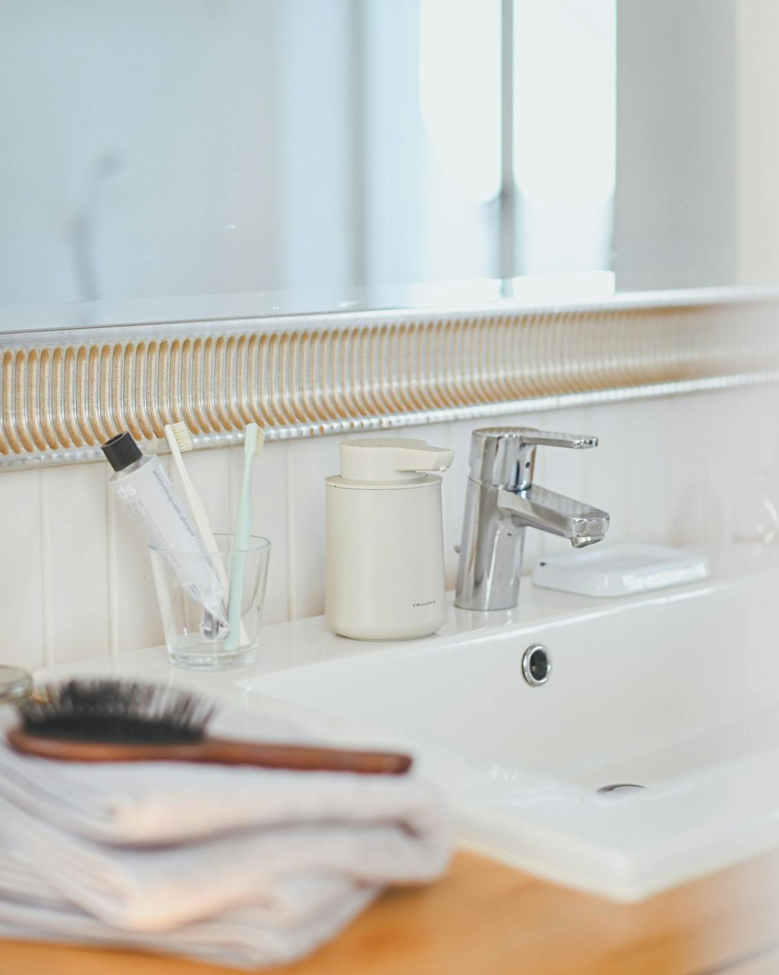 ムダを削いだ機能と価格でキッチン家電を提案しているrecolteならではのシンプルなデザインで、洗面所にもキッチンにも自然と溶け込みます。