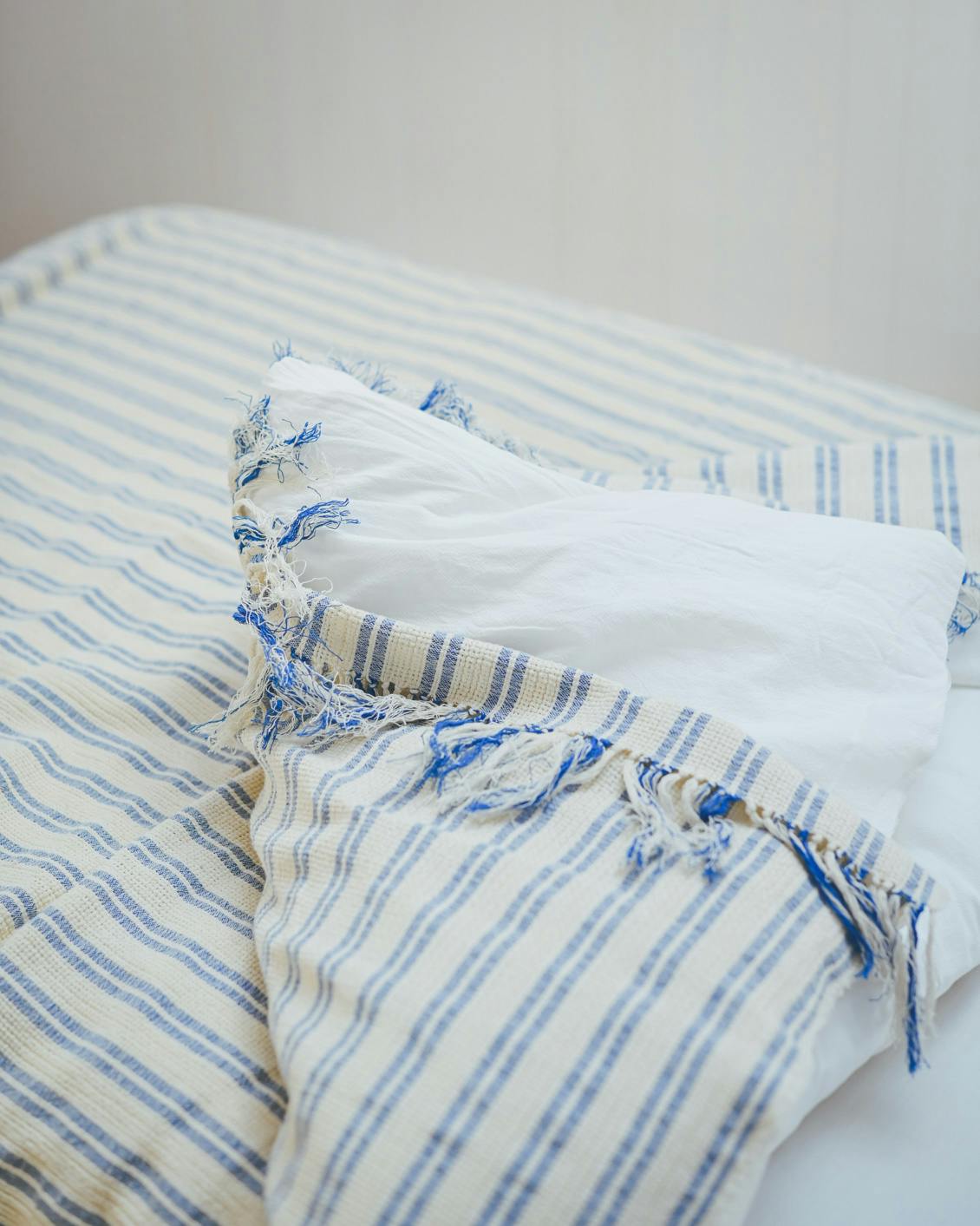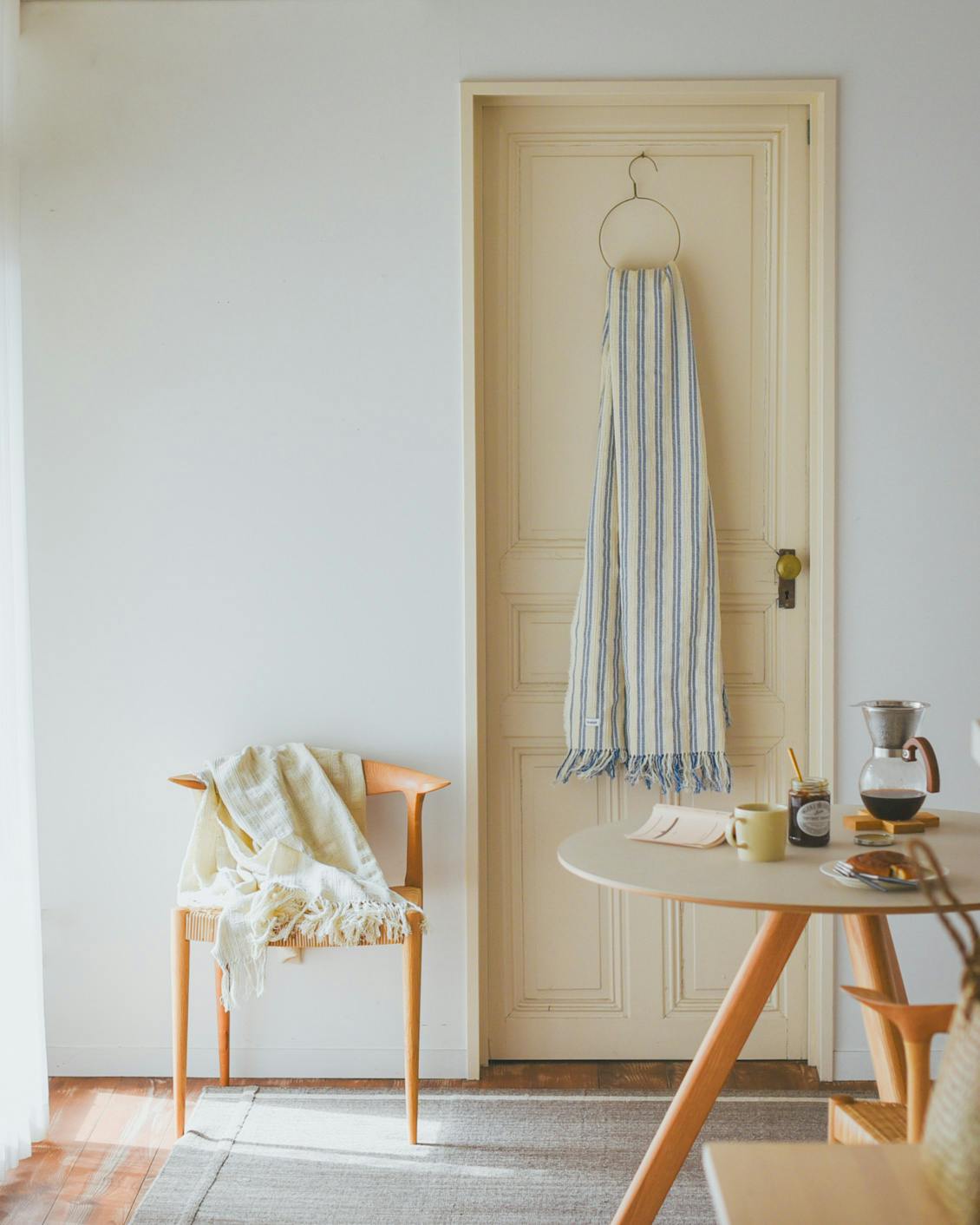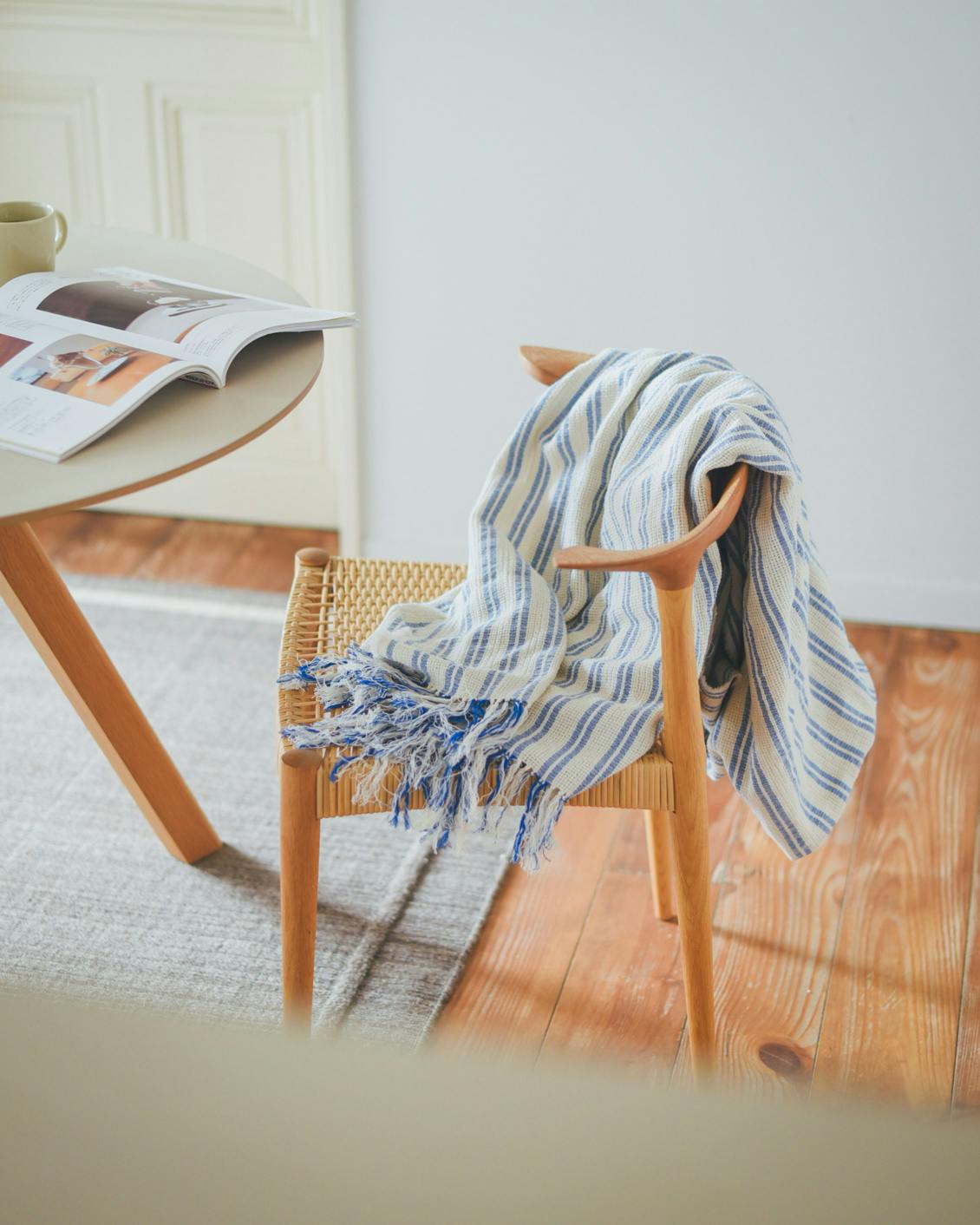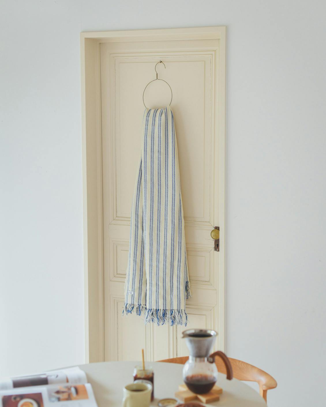 さりげないポイントになってくれるカラー。生成りに映えるブルーのストライプが空間にさわやかなリズムを与えてくれます。