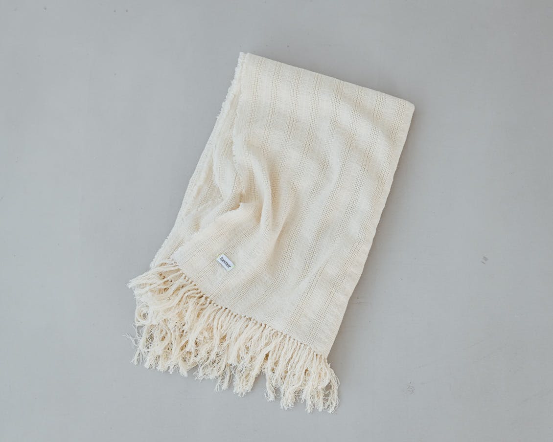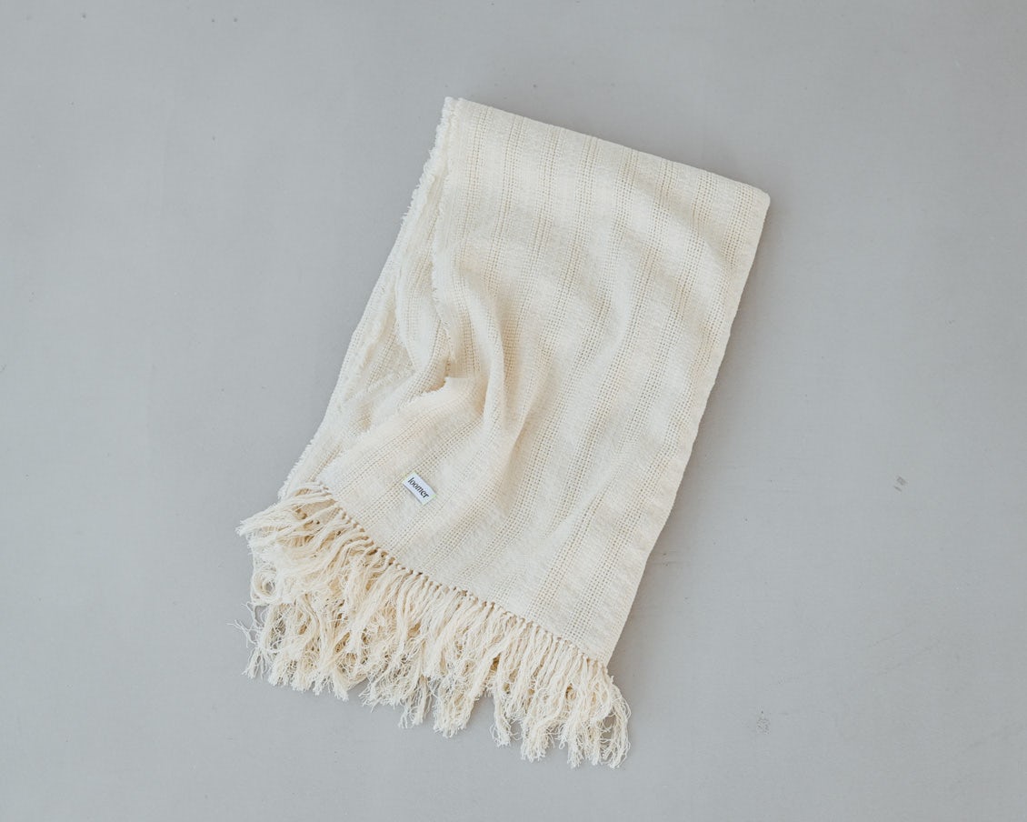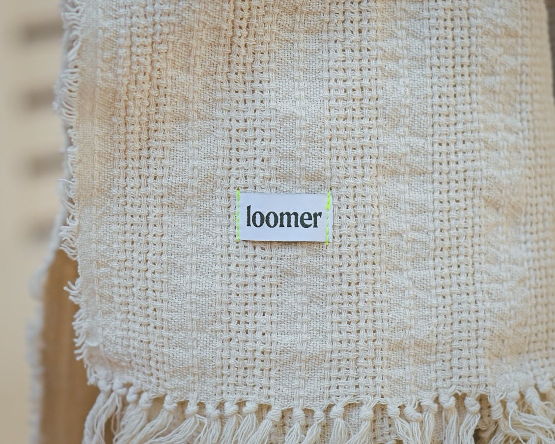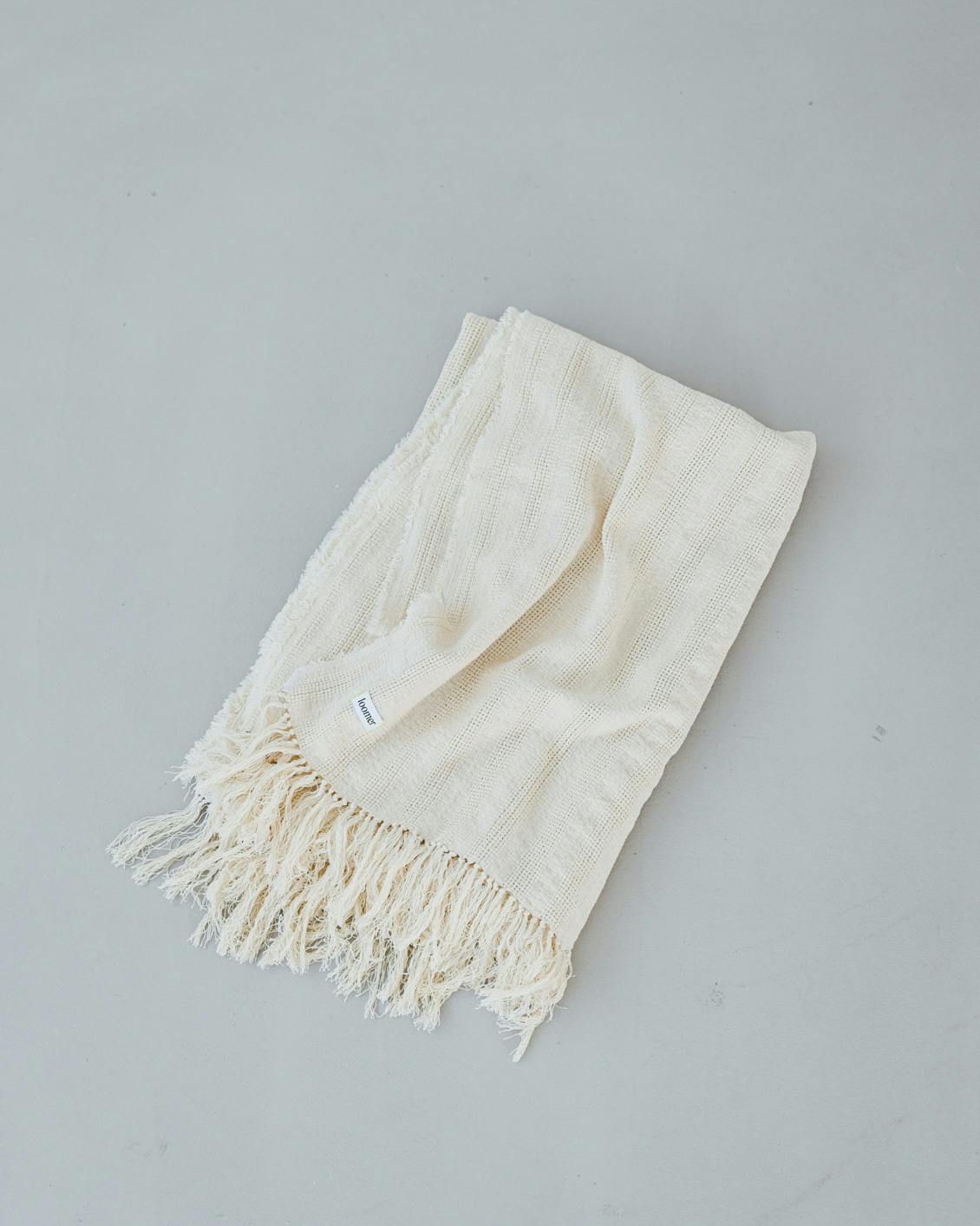 織りにこだわる「loomer」ならではの柔らかな表情、アクセントにもなっているフリンジ。バサっと無造作に置いてあるだけでサマになる一枚です。