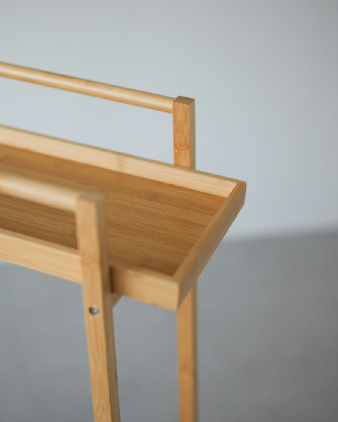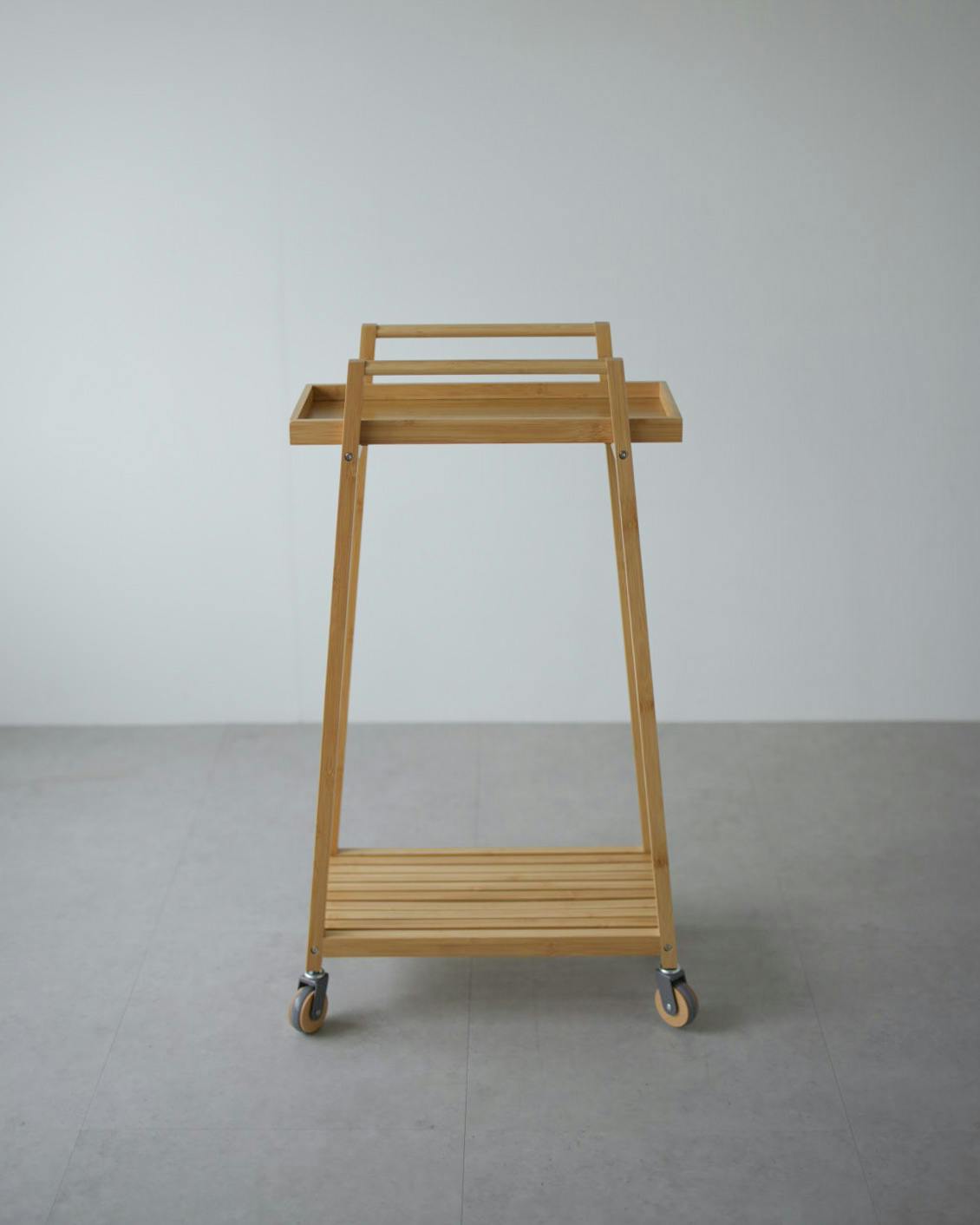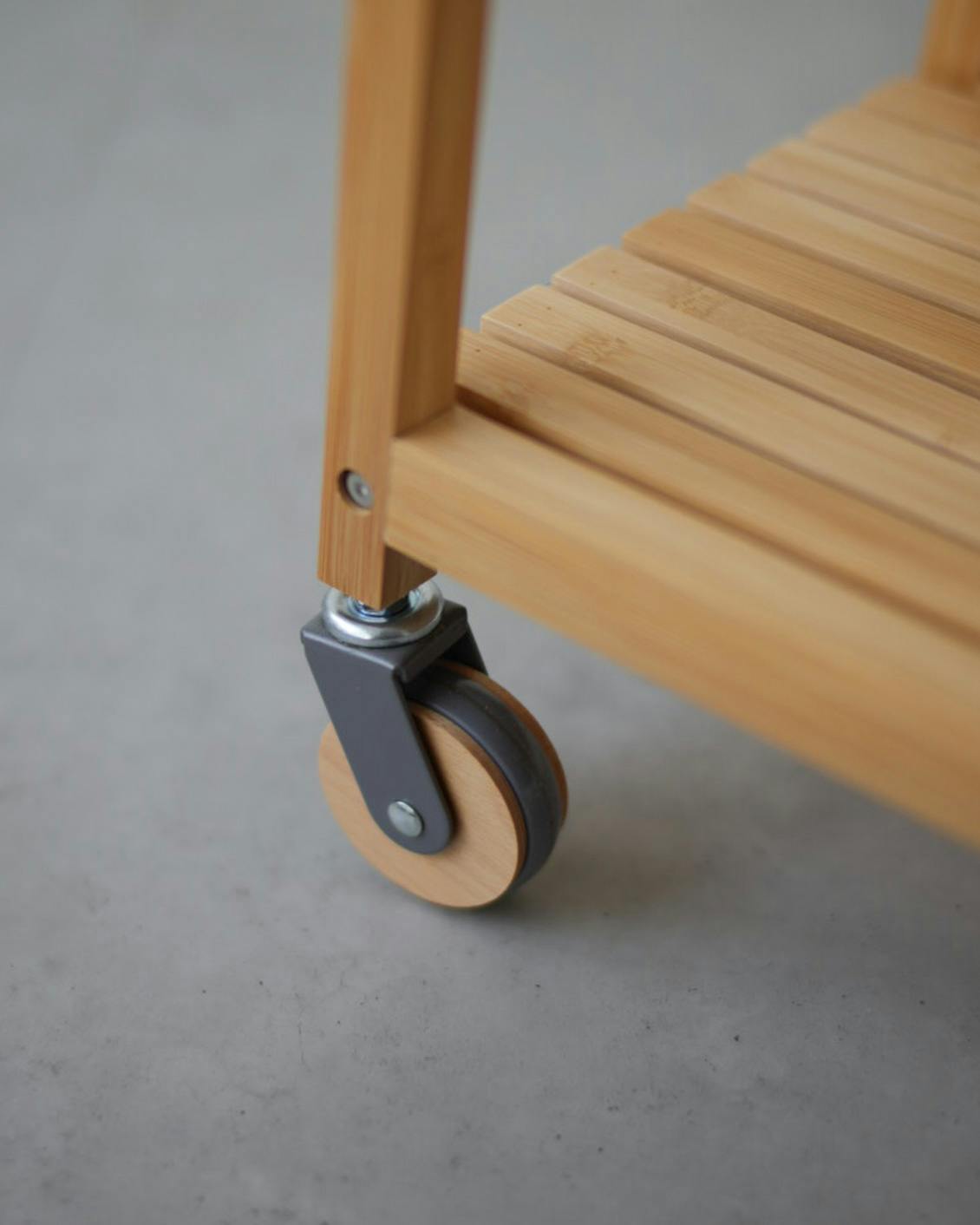 | 素材 | ワゴン本体:竹(ラッカー塗装) トレー底板 / 基材:繊維材(MDF) 表面:メラミン樹脂化粧シート キャスター:スチール、天然木、ポリウレタン ネジ:ステンレス鋼 バスケット:ポリエチレン(約90%はバイオマスプラスチック使用) |