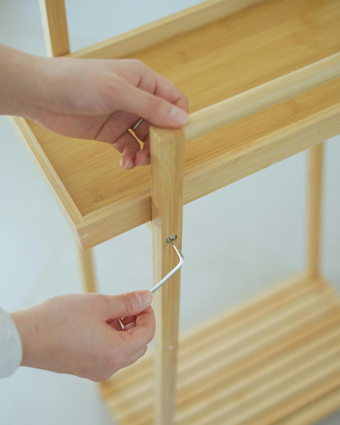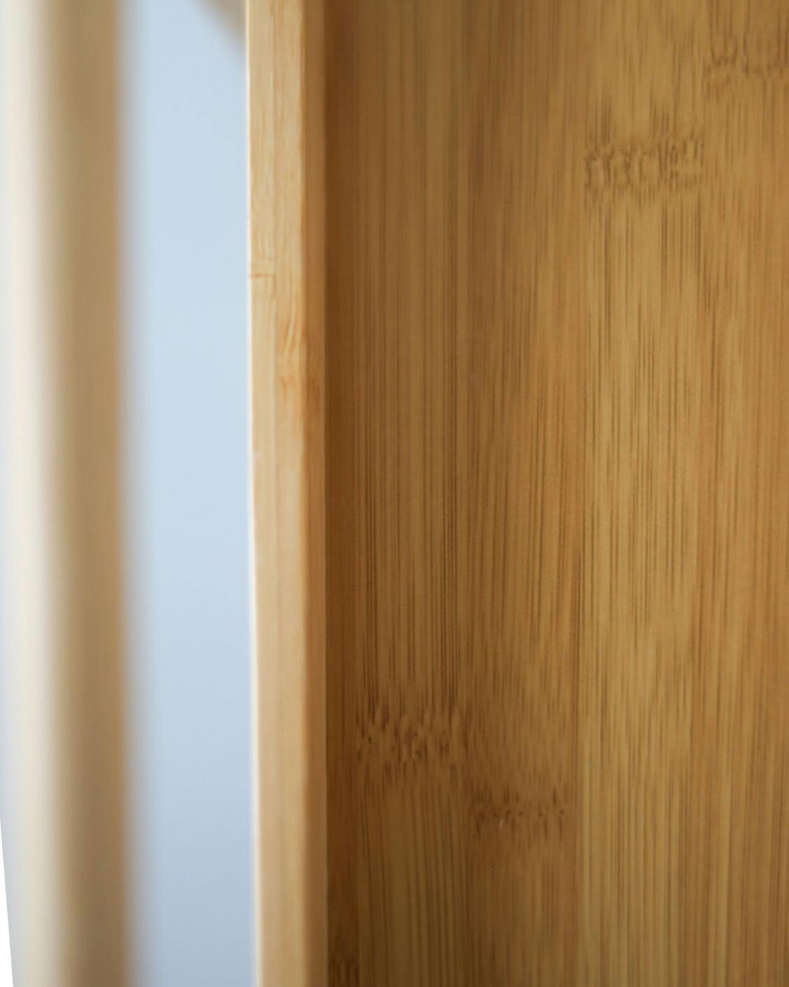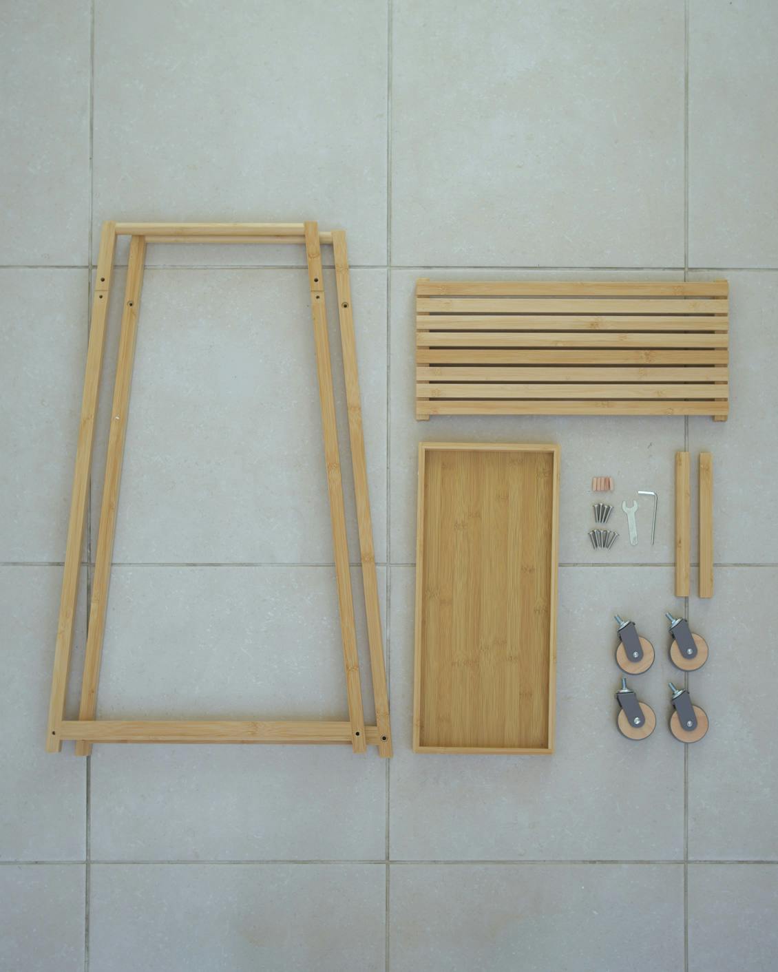 | 素材 | ワゴン本体:竹(ラッカー塗装) トレー底板 / 基材:繊維材(MDF) 表面:メラミン樹脂化粧シート キャスター:スチール、天然木、ポリウレタン ネジ:ステンレス鋼 バスケット:ポリエチレン(約90%はバイオマスプラスチック使用) |
