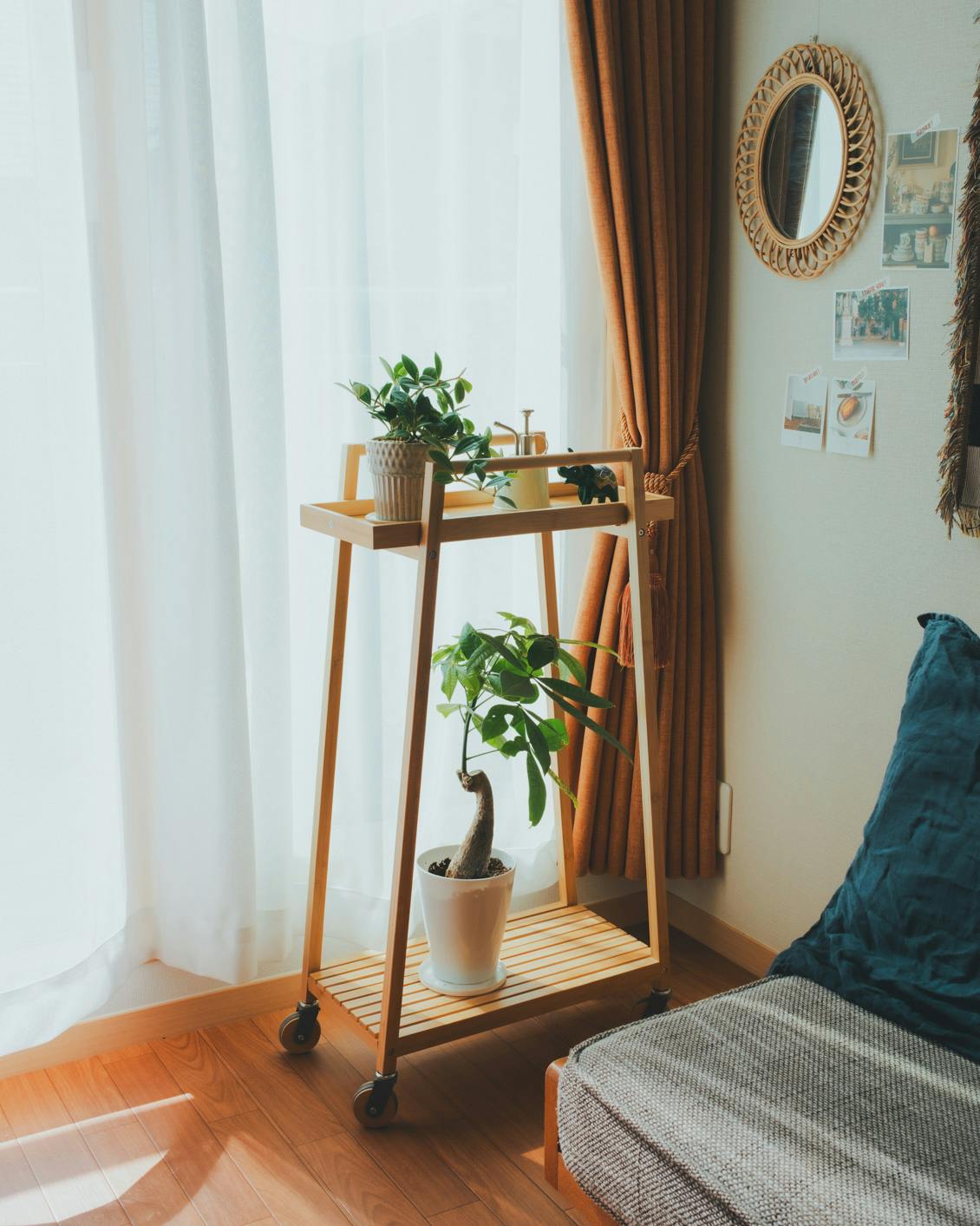 でもこのワゴンならキャスター付きで移動がとにかくラク。さっと動かせるので、思い切ってグリーンを集めてみました。」
