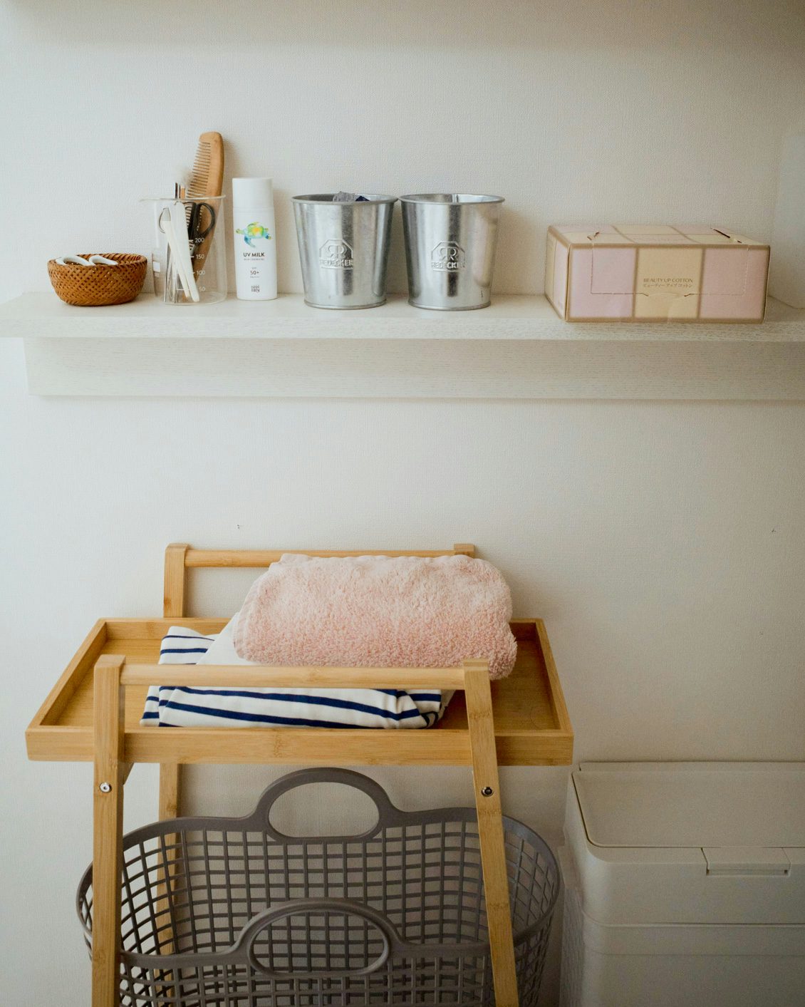 本当はお風呂上がりに着る服やバスタオルを、脱衣スペースのさっと取れる場所に置けたら……と思っていたところ、このワゴンが叶えてくれました。