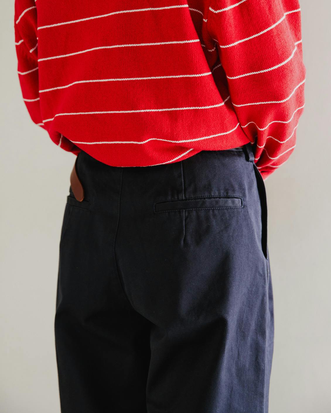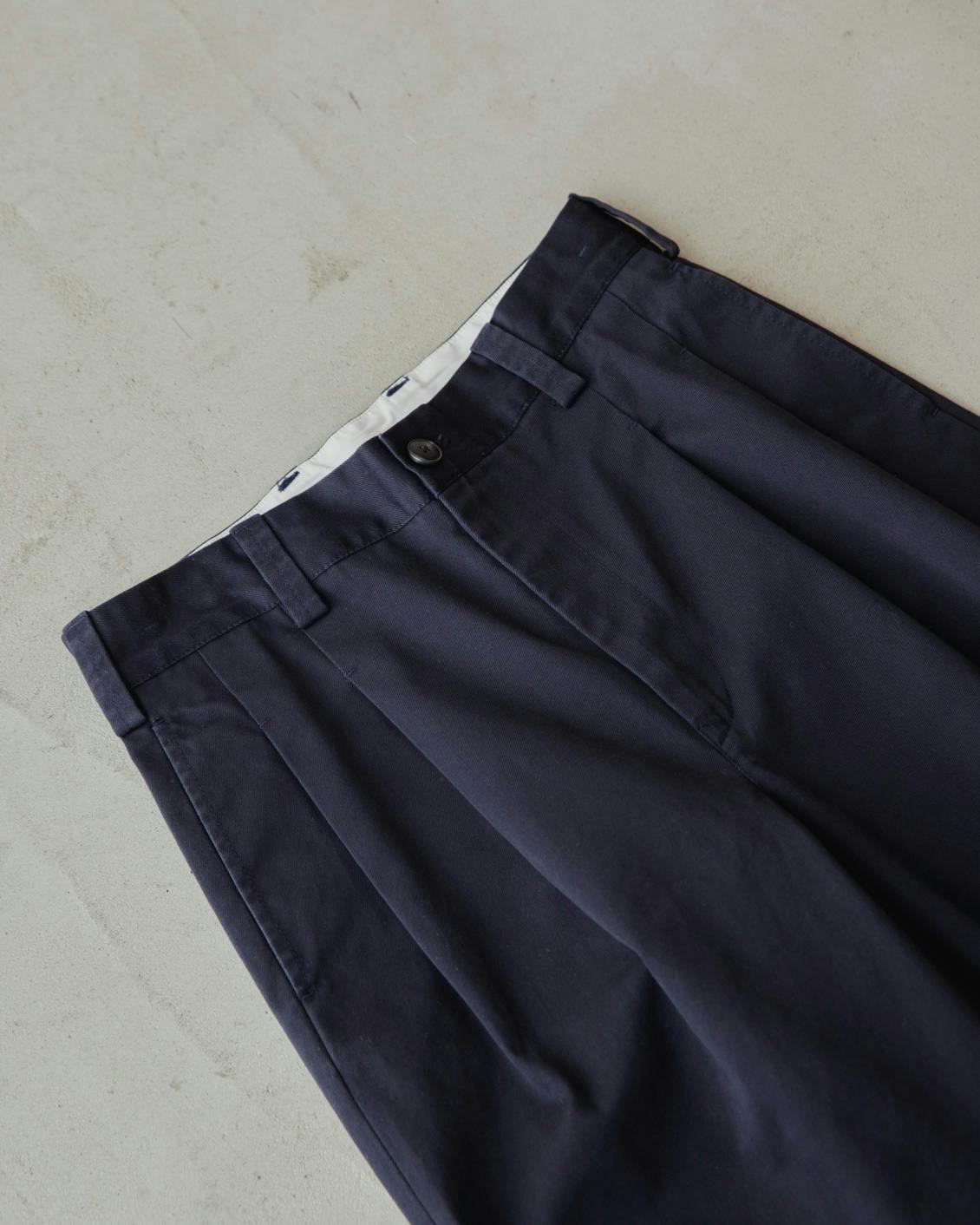 こちらも彩度は抑えめの、落ち着いた紺色。クール&クリーンな雰囲気ながら、いつものボトムス感覚で穿きやすい、良い色です。