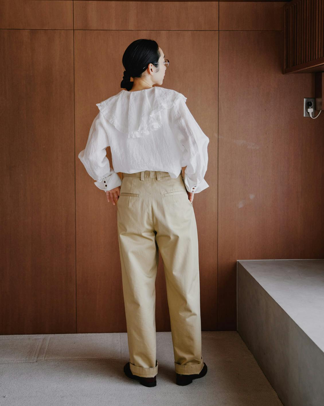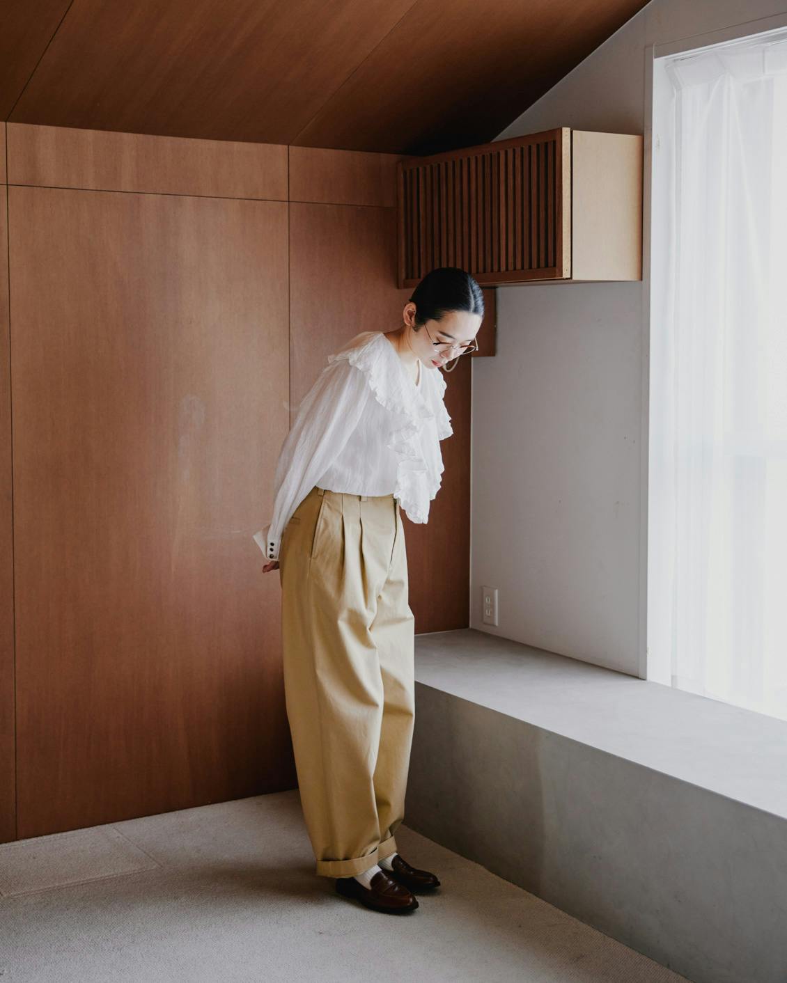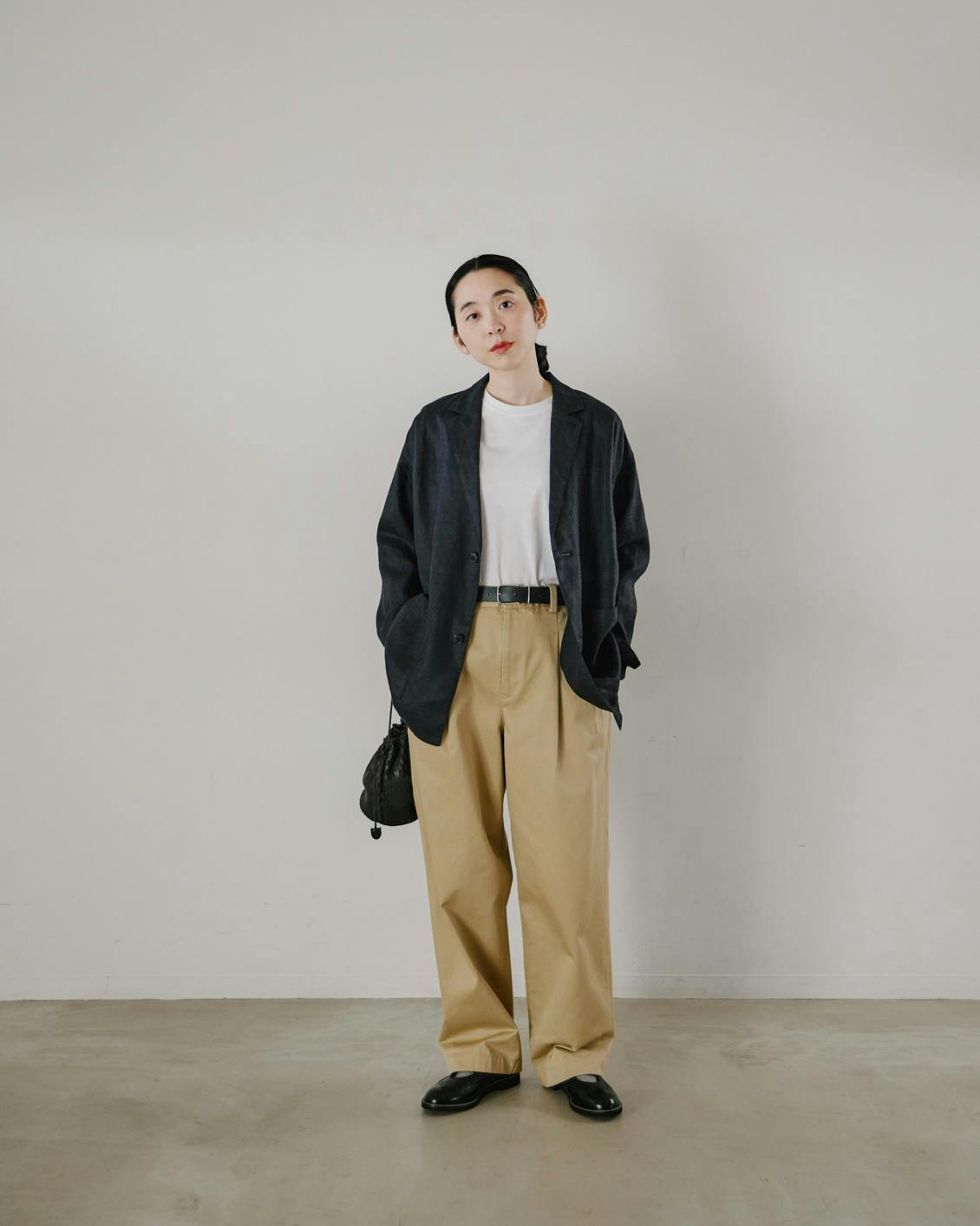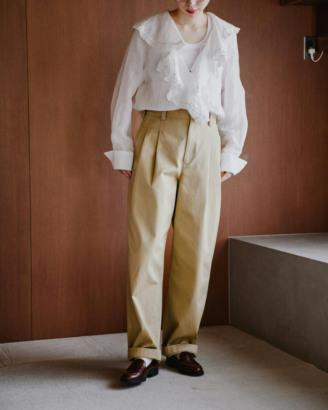 これならメンズライクで渋い雰囲気のチノパンも、無理なく、自然な着こなしを楽しんでいただけると思います。