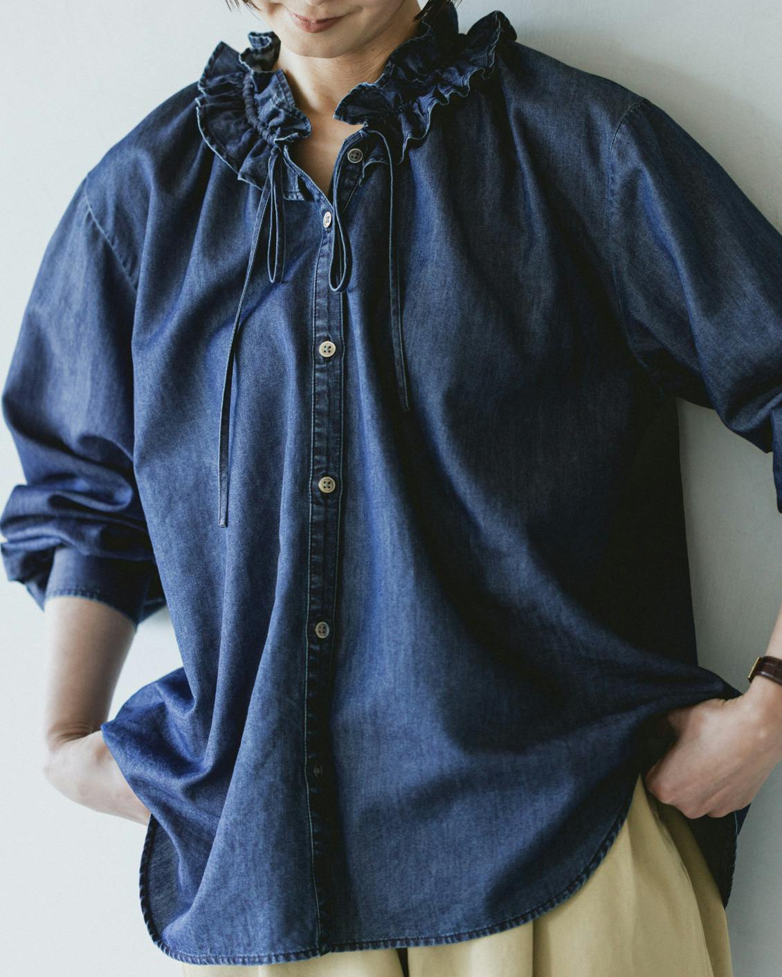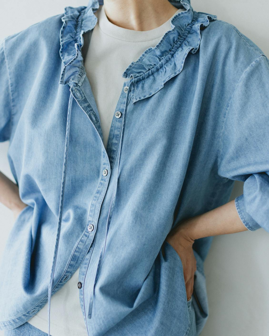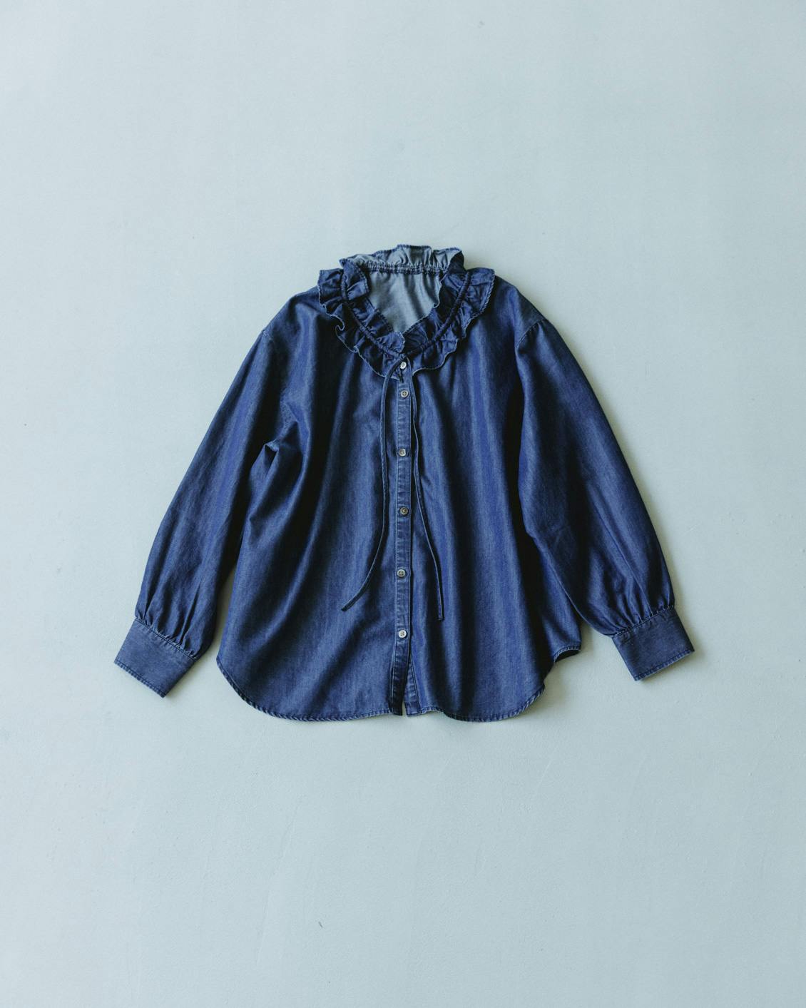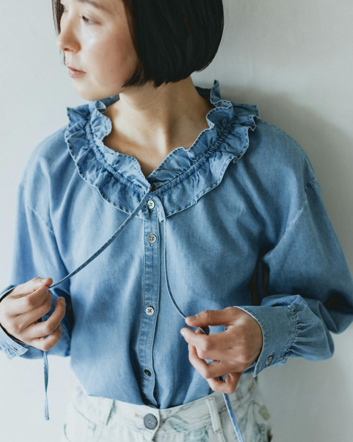 目指したのは、デニムのラフさとフリルの甘さが調和した、大人に似合うブラウスです。